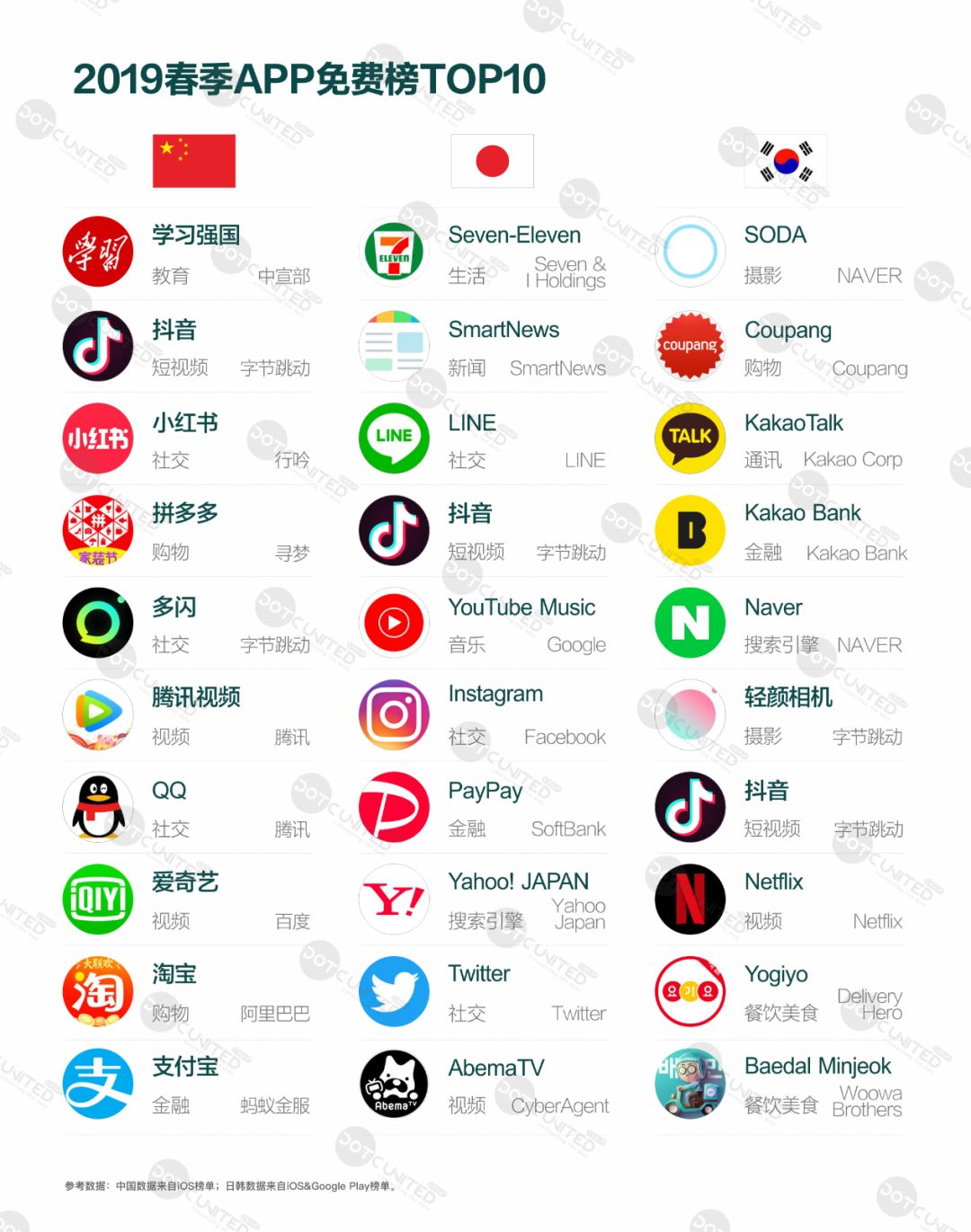 2019 年第一季度,教育类 APP 《学习强国》、生活类 APP 《Seven-Eleven》、摄影 APP 《SODA》分别登顶中日韩非游戏 APP 免费榜。三个国家冠军 APP 类型迥异,入围各国 TOP10 的 APP 类型也各有不同,总体而言,中国、日本主社交和视频类;韩国主摄影和餐饮美食类。