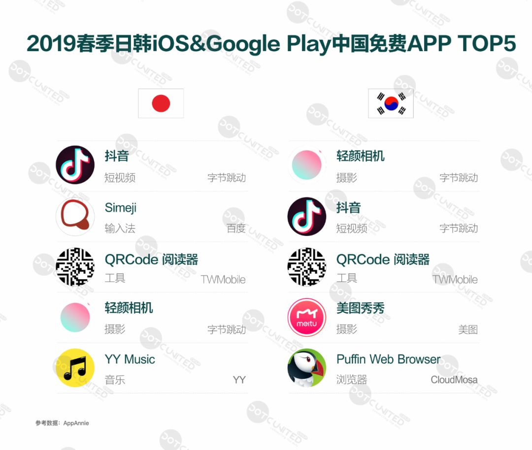 2019 年第一季度,来自中国的 APP 在日韩市场的表现可谓亮眼,中国 APP 在日韩两个国家的榜单排名基本都集中在 TOP100 内。字节跳动的《抖音》《轻颜相机》以及 TWMobile 的二维码阅读 APP 《QR Code 阅读器》在日韩市场均有优异表现。