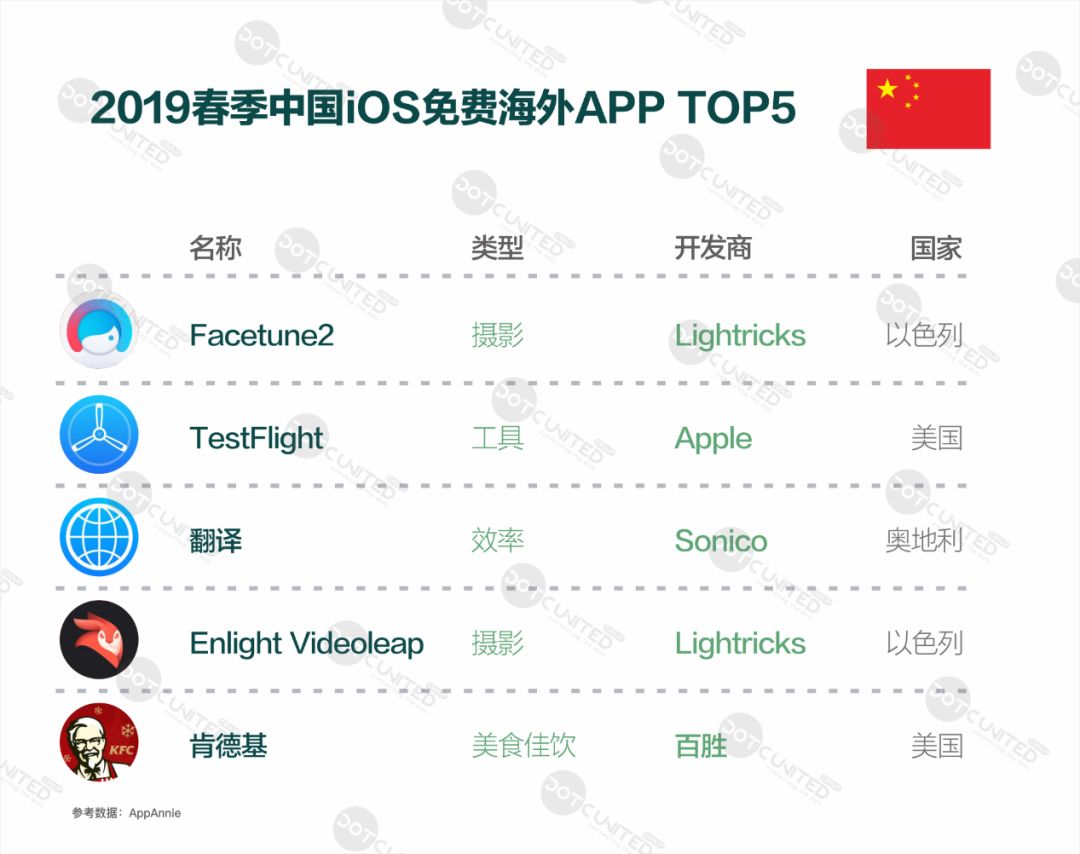 中国 iOS 免费 APP 日榜单 TOP200 中,来自海外的 APP 数量不足 20,主要来自美国、以色列等国家。2019 年第一季度,中国 iOS 榜单上表现良好的海外 APP 有来自以色列的照片美化编辑 APP 《Facetune2》和视频编辑 APP《Enlight Videoleap》、来自美国的测试软件《TestFlight》、吃货必备 APP《肯德基》,以及奥地利翻译神器《iTranslate(翻译)》。《Facetune2》被称为是外国版的美图秀秀,拥有强大的照片编辑功能且操作简单。《Facetune2》第一季度在中国 iOS 榜单排名直线上升,目前基本都保持在 TOP50 内,在国内是《美图秀秀》最有力的竞争对手。