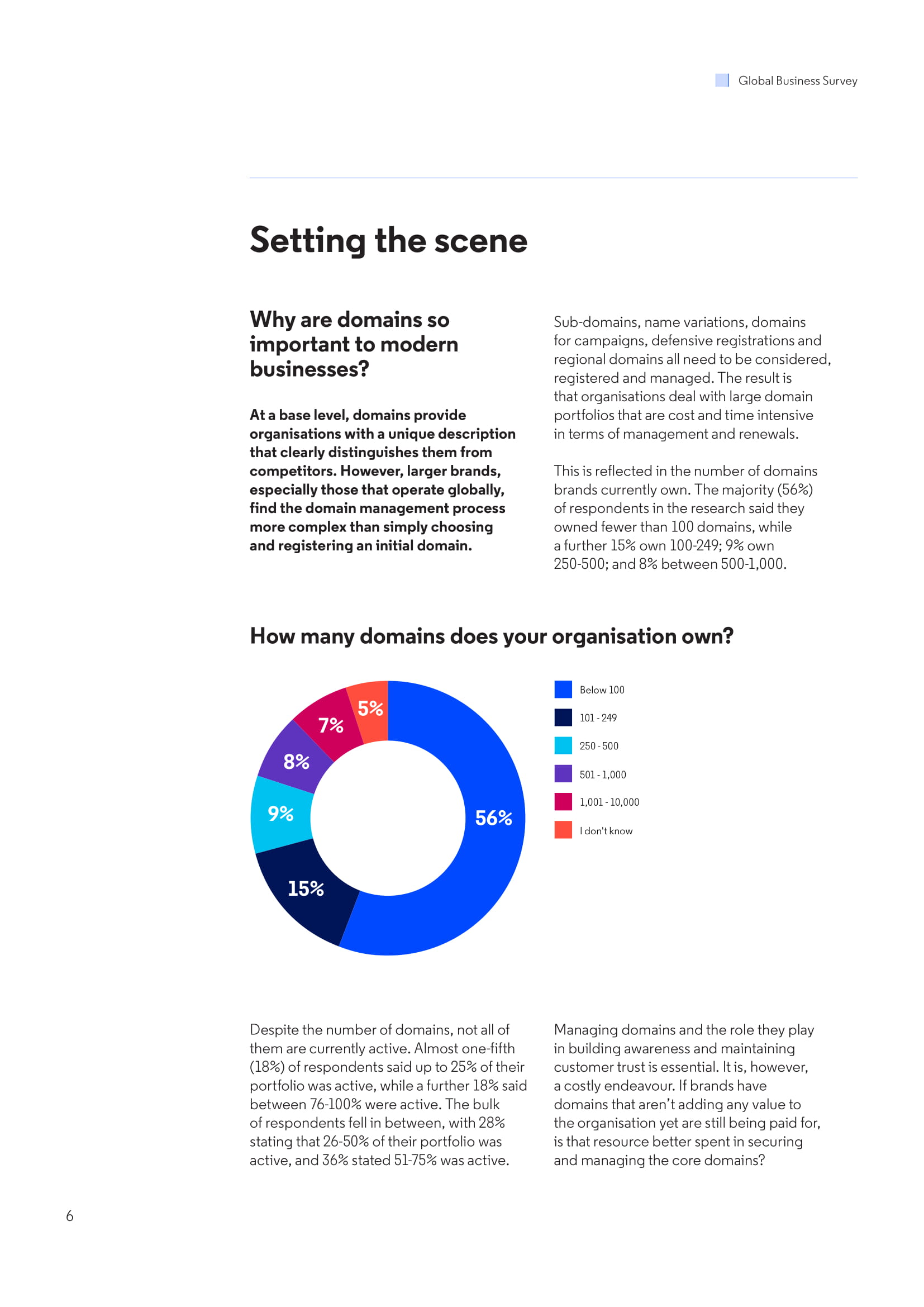 56%的品牌拥有多达100个域名,但只有18%的品牌表示,超过3/4的域名是活跃的。