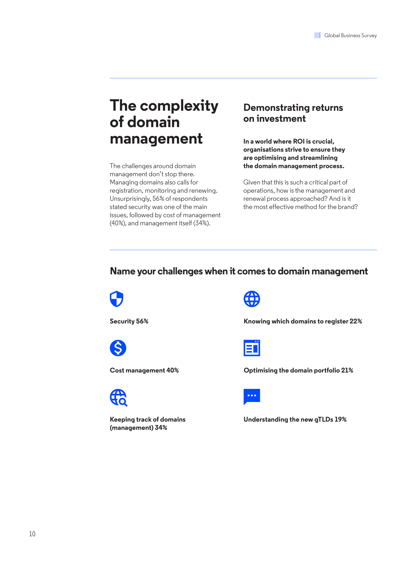 安全(56%)、成本(40%)和域跟踪(34%)是域管理中被提及最多的挑战。