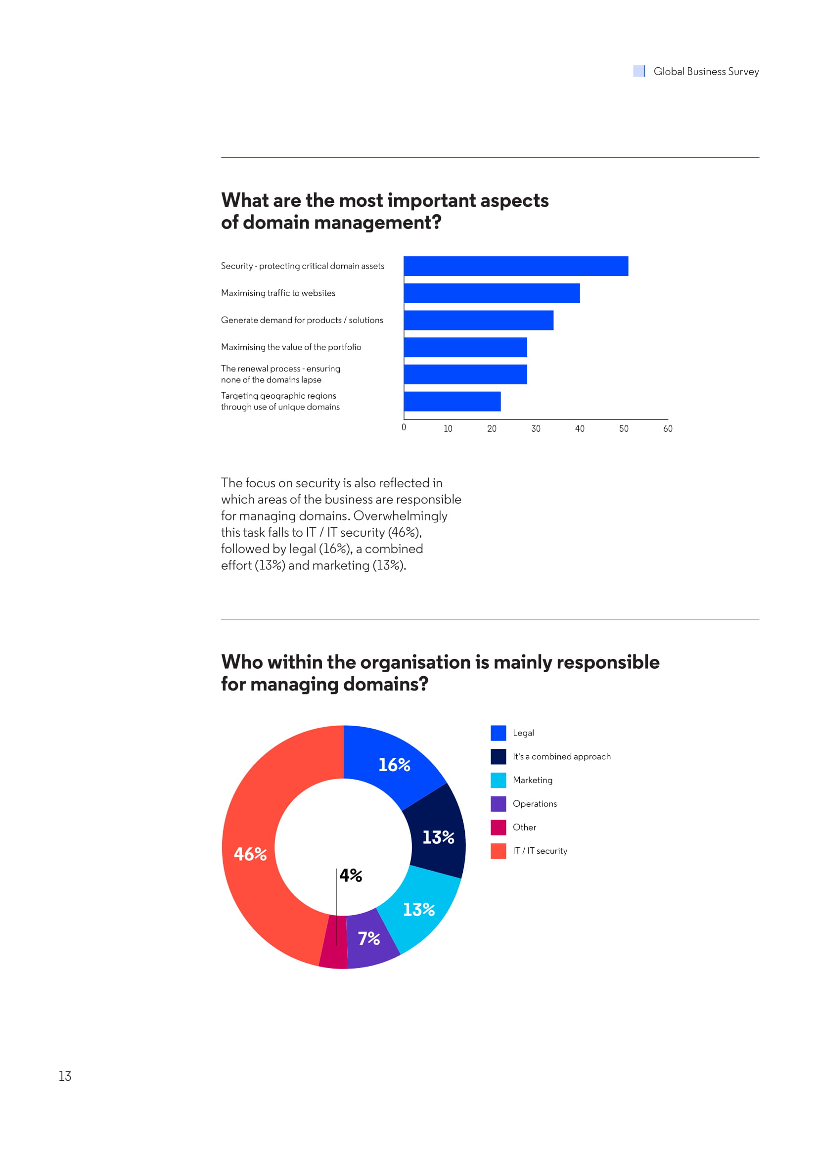 域管理的责任主要在于IT/IT安全(46%),其次是法律(16%)、联合努力(13%)和营销(13%)。