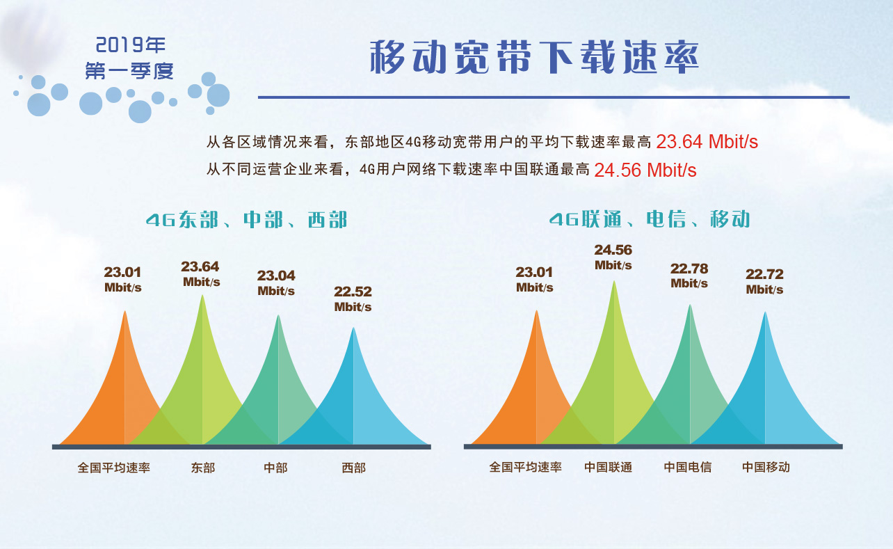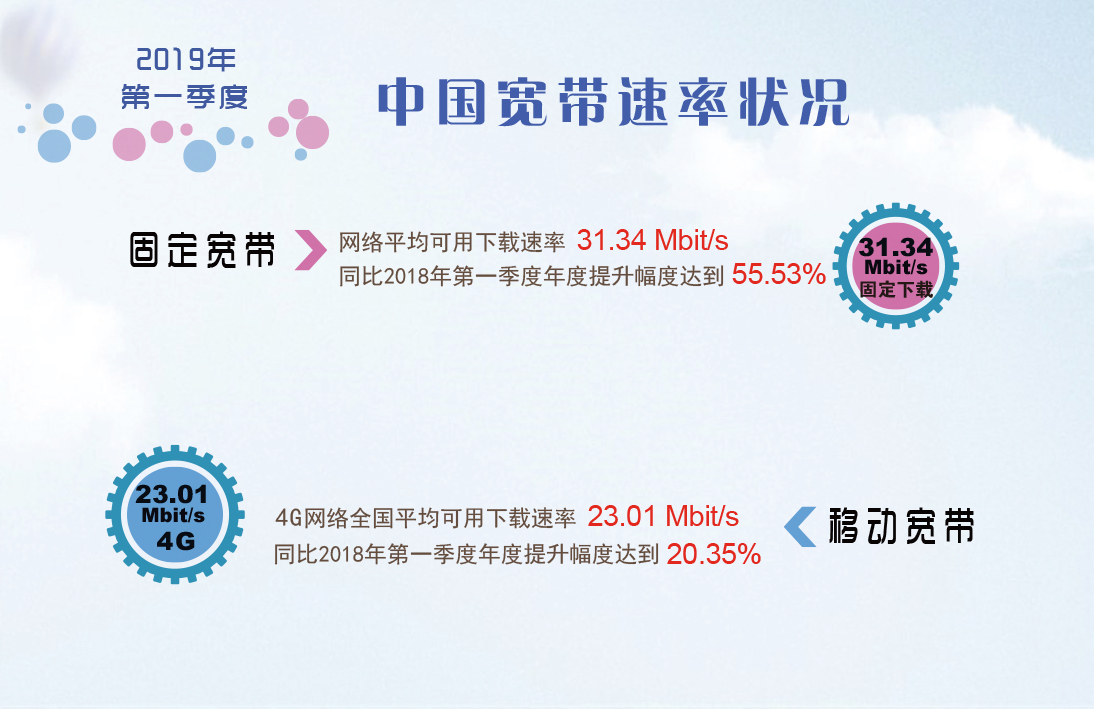 宽带发展联盟发布了2019年第一季度《中国宽带速率状况报告》(第23期)。报告显示,2019年第一季度我国固定宽带网络平均下载速率达到31.34Mbit/s,环比上季度提升了11.7%,同比去年同期提升了11.19Mbit/s,年度提升幅度达到55.5%;我国移动宽带用户使用4G网络访问互联网时的平均下载速率达到23.01Mbit/s,同比去年同期提升幅度也达到了20.4%。相关数据情况表明,我国固定和移动宽带用户体验速率均在快速提升,宽带网络提速工作成效显著。