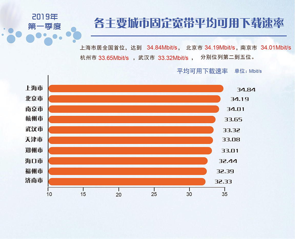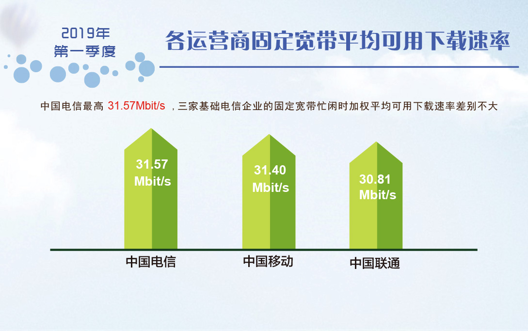 “提速降费”工作是党中央、国务院的重大决策部署,2019年5月14日的国务院常务会议又对今年的网络提速降费工作做出了专项部署,指出“进一步推进网络提速降费、增强网络基础能力,不仅给企业和群众增便利添实惠,更能拉动有效投资和消费、带动扩大就业、发挥数字经济等新动能对经济社会发展的支撑引领作用,是既利当前、又惠长远的一举多得之策。”近年来,我国深入推进光纤宽带和4G网络建设,实现了对城乡地区的普遍覆盖。截至今年3月底,全国光纤宽带用户占比达到91%,4G用户占比达到75%,均位居全球先进行列。用户签约速率百兆及以上已经成为宽带业务主流,部分地区开始启动千兆(Gb)网络接入服务部署;4G网络性能在不断优化;互联网企业服务能力也在不断的增强。对比网速提升的几个标志性节点,我国固定宽带下载速率自2016年第二季度首次超过10 Mbit/s,到2018年第一季度超过20 Mbit/s,用时近两年;而到2019年第一季度就已超过了30 Mbit/s,提升10 Mbit/s仅仅用时一年,可见我国网络提速步伐正在不断加快。