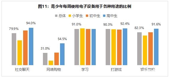 2.电子产品高度渗透青少年的学习与休闲。调查结果显示,青少年总体每周将电子设备用于学习、游戏的比例达90%以上。高中组青少年则在社交聊天、学习、游戏、娱乐放松方面的使用人群占比均超90%,在网络购物方面的使用率也显著高于总体23.5个百分点。