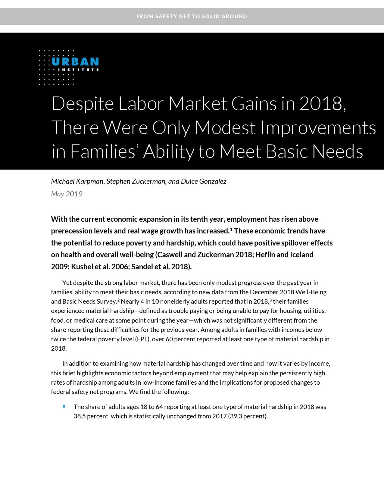 美国研究机构Urban Institute发布了一份2018年美国家庭福利及基本需求的调查报告。报告指出,尽管美国失业率降至五十年来的低点、平均时薪仍然在上涨,但对于接近一半的美国家庭来说,包括住房、食品和医疗在内的多项基本支出仍然难以负担。