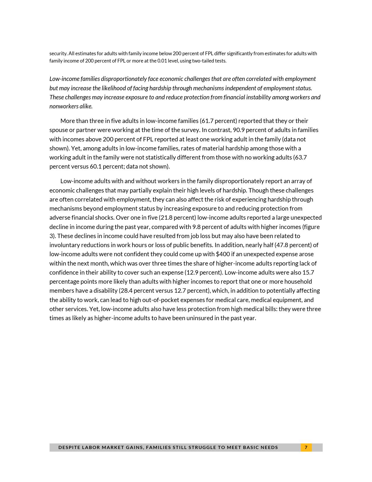 导致这些家庭生活如此拮据的原因似乎也可以从调查结果中窥得一角。这类家庭往往经历过意外的收入大幅度缩水、家庭成员身体残疾、缺少保险,以及不得不承担超高的住房支出。在收入稍高一些的群体中,面临这些困境和风险的家庭比例远远小于上述群体。