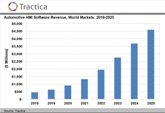 Tractica预测,支持人工智能的汽车HMI软件市场将从2018年的4.628亿美元增长到2025年的46亿美元。这一收入的绝大部分将来自语音和语音识别应用,其次是驾驶员面部分析和情感识别以及手势识别。