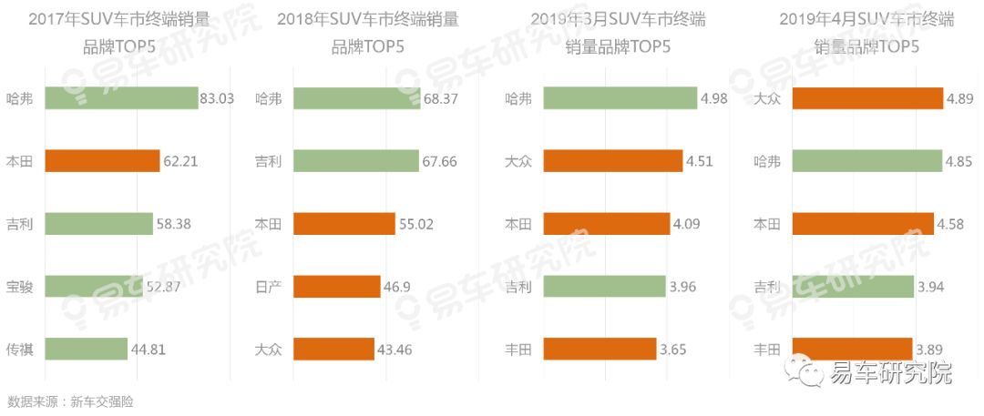 2019年4月大众超越哈弗,领衔SUV品牌终端销量排行榜