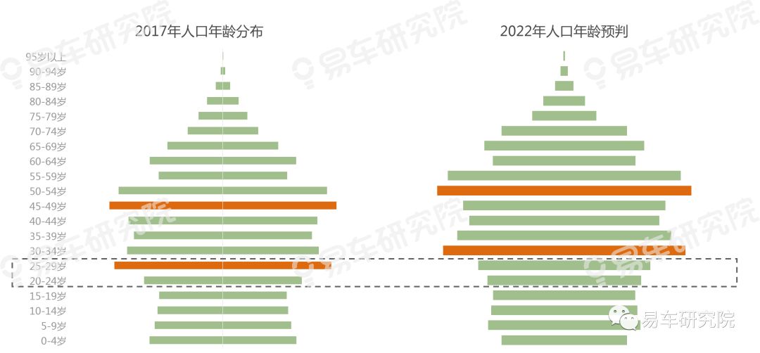 据国家统计局人口抽样数据显示,2017年二十多岁的年轻用户占我国总人口比例超过15%。预计2022年该占比将大幅下滑至12%以内,呈现明显的断崖式下滑趋势。由于中国品牌SUV以吸引收入相对较低的二十多岁年轻用户为主,随着该消费群体占比断崖式下滑,势必会冲击到中国品牌SUV的市场表现,且是长期冲击