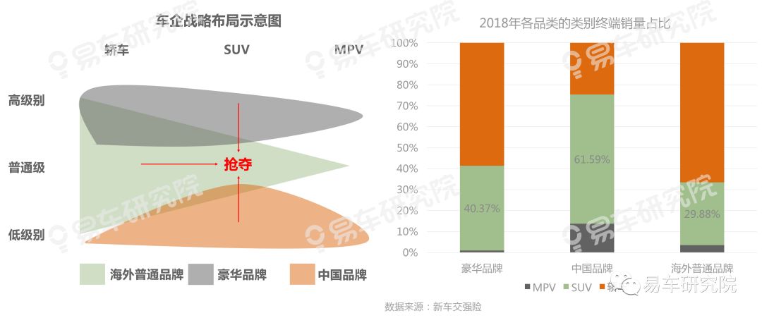 根本原因:2017-2018年SUV是多数中国品牌核心市场,缺乏战略纵深;SUV是多数海外品牌新兴市场,充满侵略性