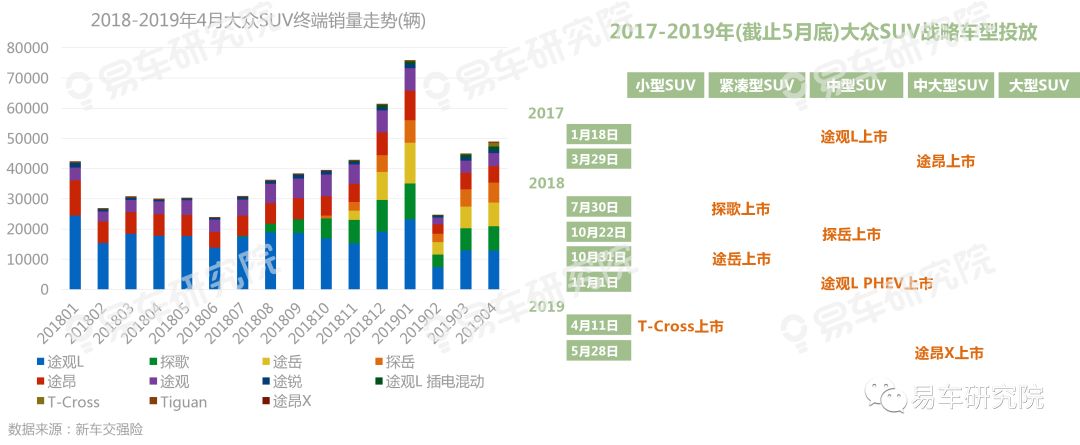 推SUV战略与大规模降价促销,助大众SUV持续上量并构建起产品矩阵,2019年4月终端销量超哈弗成SUV新领导品牌