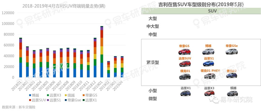 2019年3-4月吉利多款主力SUV的终端销量清一色跌破万辆,高度聚焦入门级与年轻用户的吉利战略转型迫在眉睫