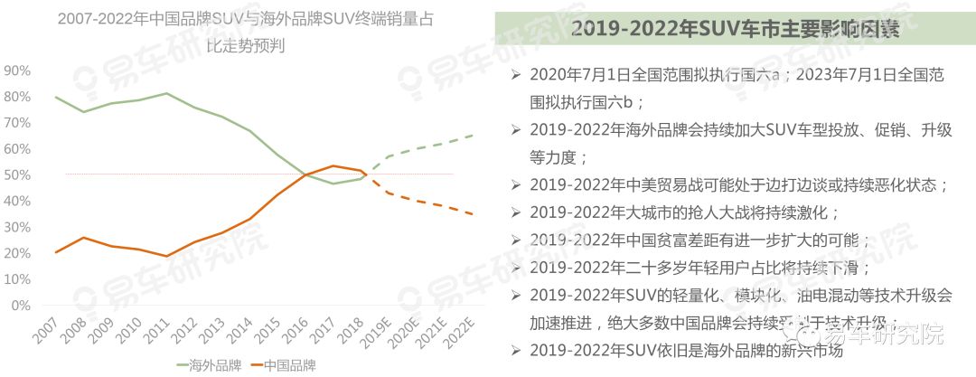 国五国六切换、海外品牌加大SUV投放、省会城市抢人大战愈演愈烈、中美贸易战快速恶化等直接原因,与年轻用户占比下滑、收入分化扩大、加速技术升级等根本原因,共同助力海外品牌SUV的终端销量份额超越中国品牌。2019-2022年上述因素将持续发酵,海外品牌主导SUV车市的竞争格局将“长期化”。中国品牌SUV如继续贪图“靠天吃饭”,只能坐以待毙,唯有脚踏实地变法图强,方能突出重围