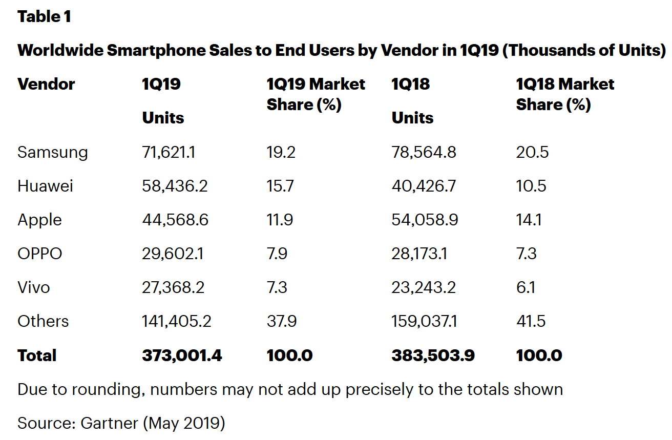 根据Gartner的数据,2019年第一季度,全球智能手机销量下降2.7%,总计3.73亿部。华为是全球第二大智能手机供应商,并继续缩小与三星的差距。