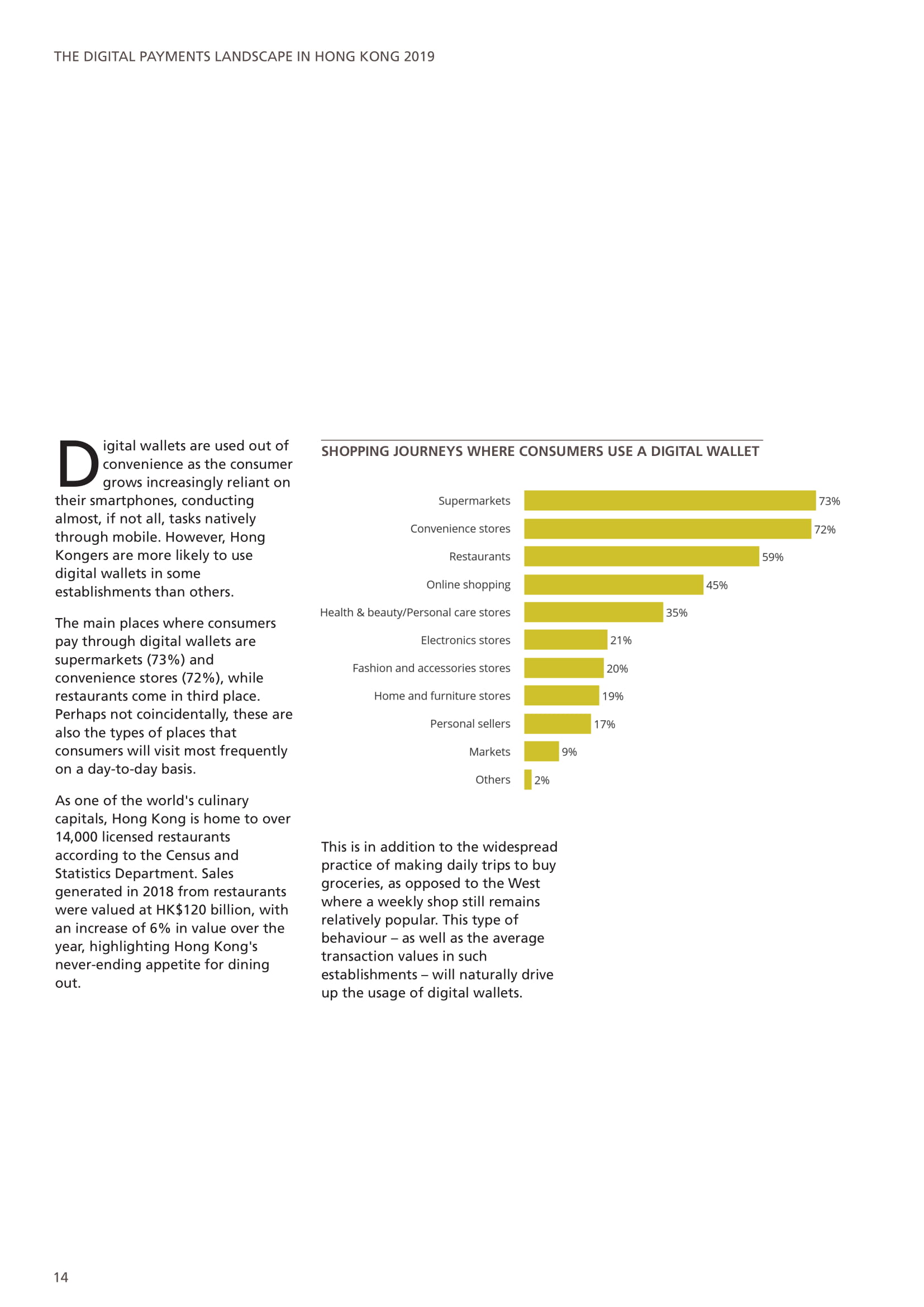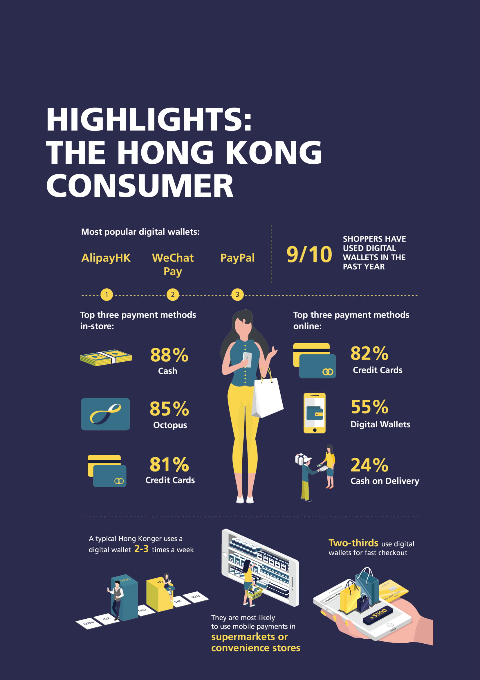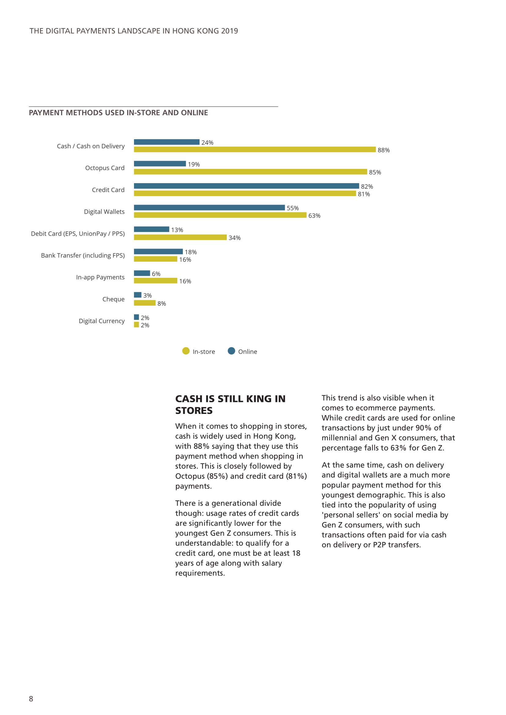 现金仍然是商店的主要支付方式,但香港消费者也广泛使用八达通、信用卡和数字钱包支付。