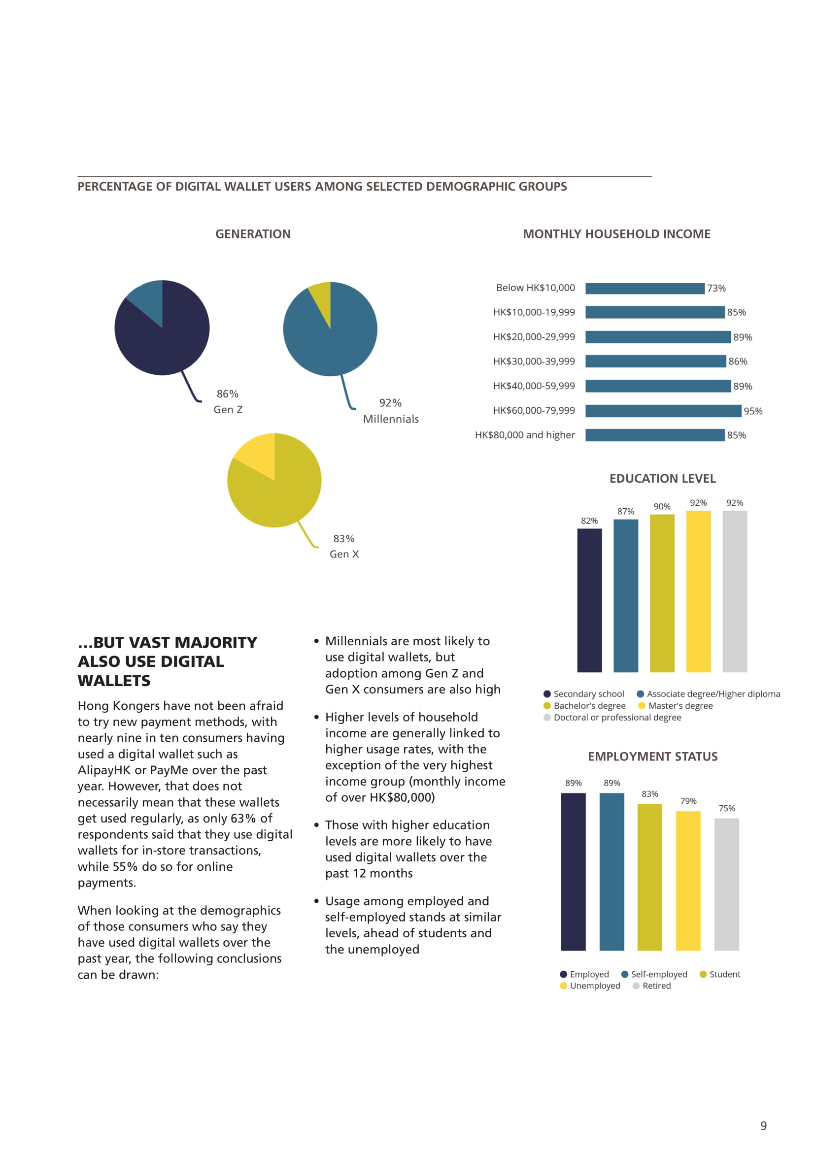 千禧一代更有可能使用数字钱包,较高的普及率与高等教育和收入水平有关。