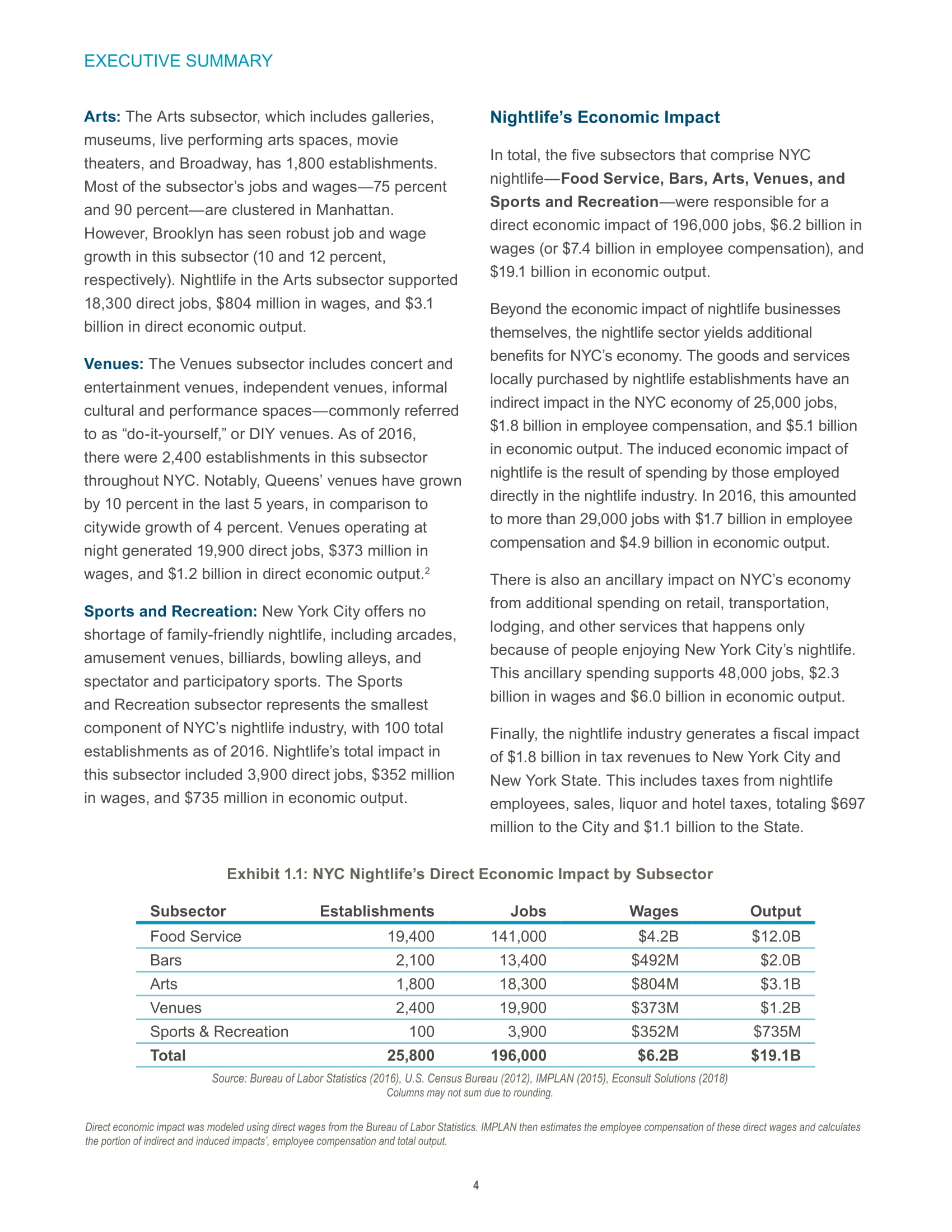 纽约市夜生活对经济的直接影响为提供196000个工作岗位、62亿美元的工资和191亿美元的经济产出。