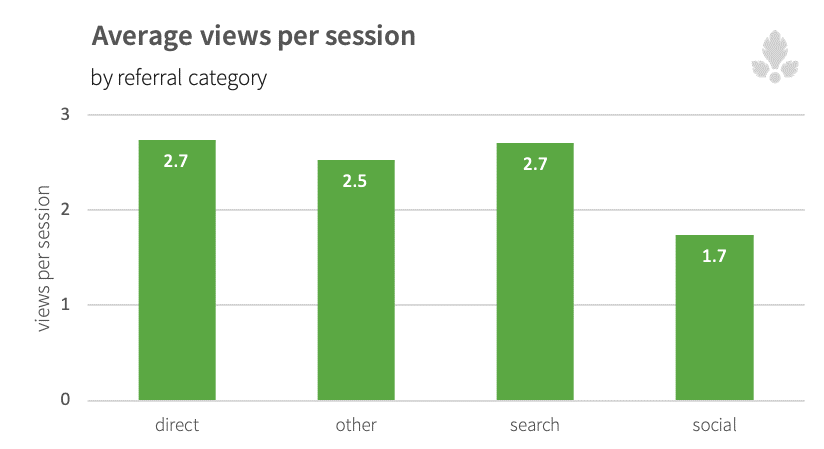 通过搜索推荐的访问者平均每个会话有2.7个页面浏览量,相当于直接访问量。这远远高于社交媒体推荐的访问者每次会话的平均浏览量(1.7),这表明通过社交媒体推荐的读者对内容的参与程度不如其他读者。