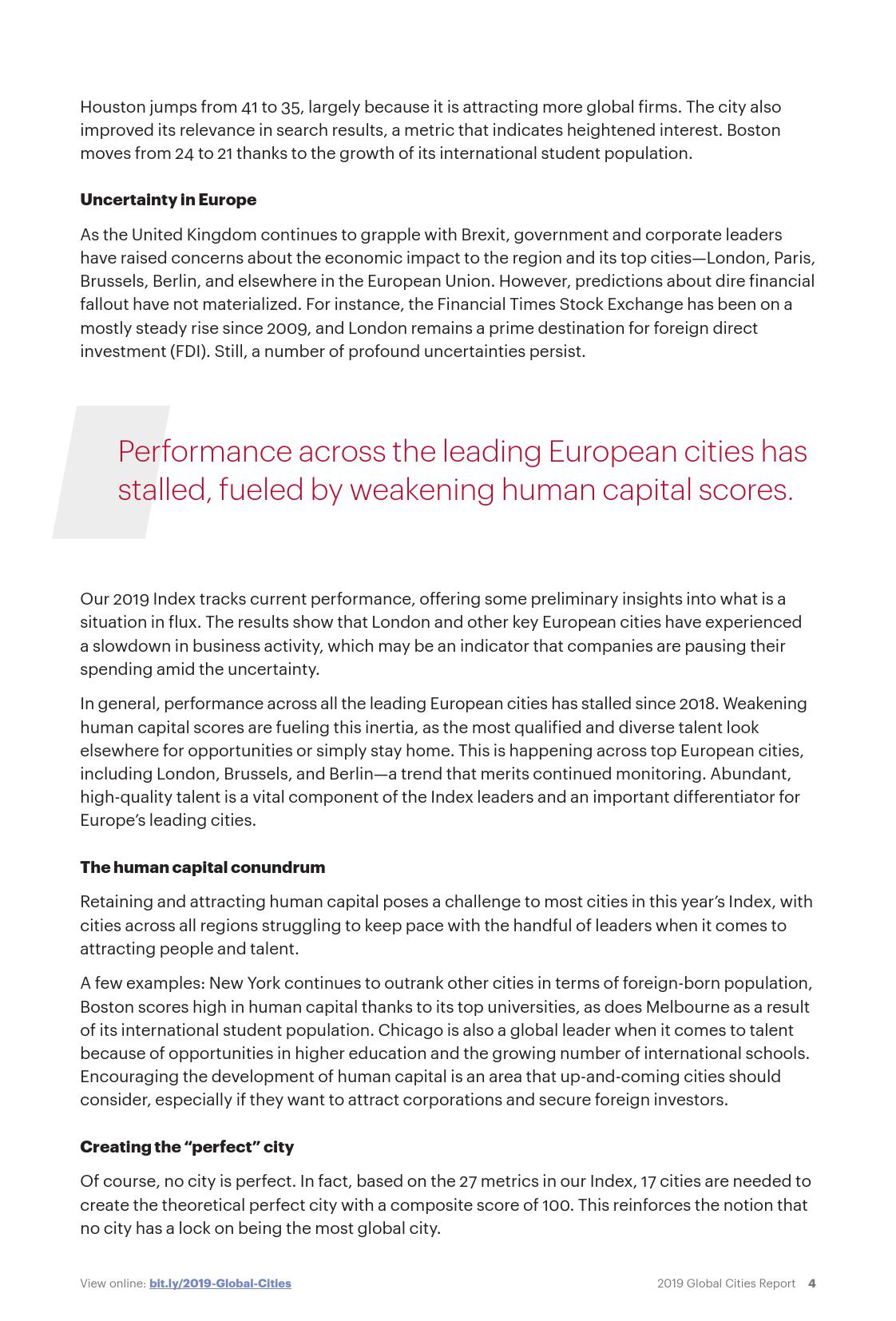 与此同时,今年的另一大趋势是欧洲领先城市总体得分陷入停滞,尤其是人力资本维度得分下降尤为明显,充分体现人才因素是所有城市——无论是发达还是发展中国家的城市——打造长期可持续城市竞争力的关键。