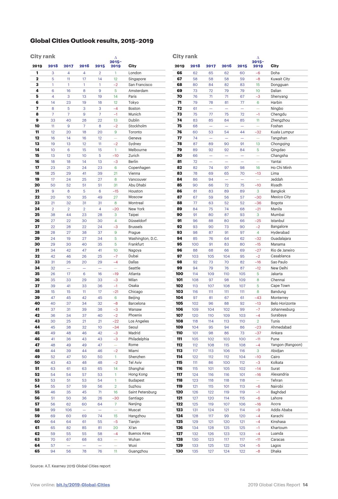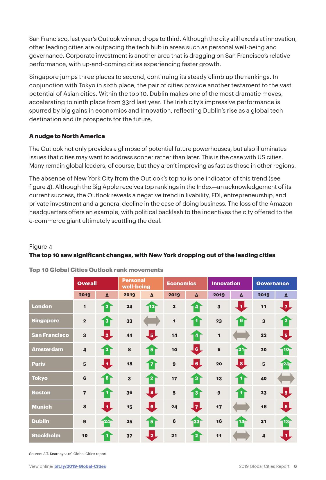 《全球城市潜力排名》评选出了可以与老牌城市相媲美的新兴城市。得益于其稳定的发展步伐,伦敦今年跃居榜首,而其他城市中心正紧跟其后。在连续四年荣登潜力排行榜榜首后,旧金山今年跌至第三位,虽然其在创新方面仍得分靠前,但在居民幸福感和治理等方面的表现被其他领先城市赶超。