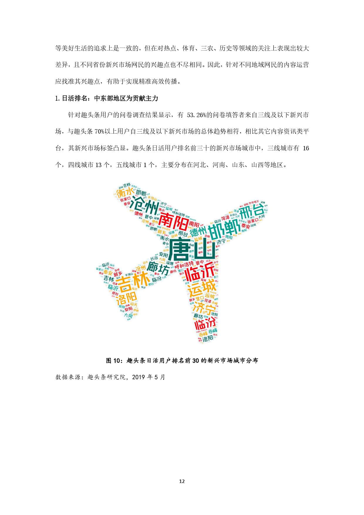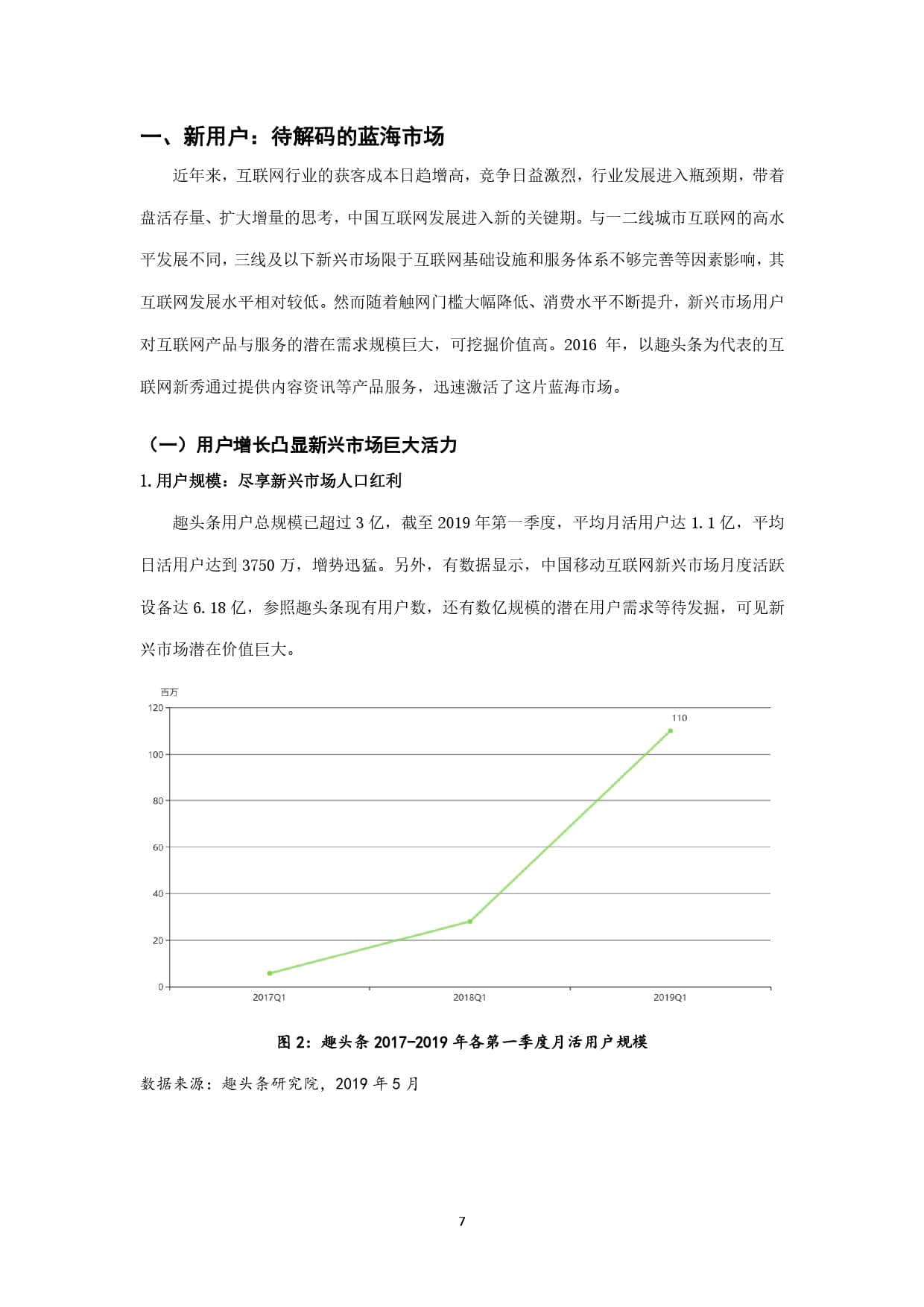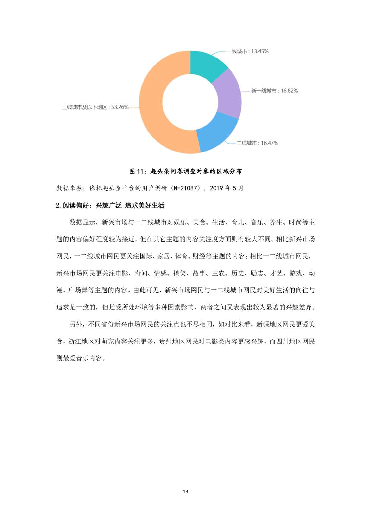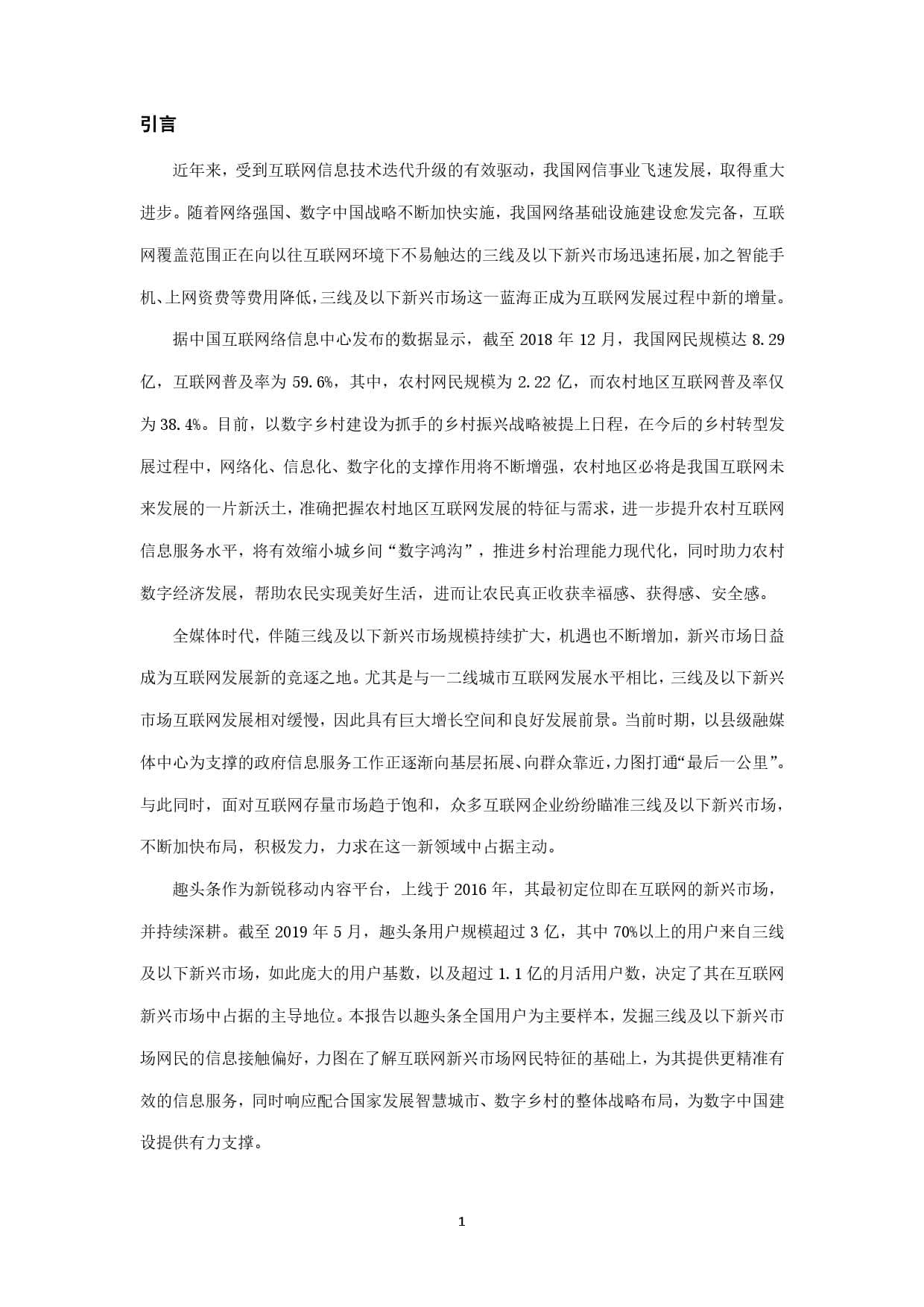 趣头条作为新锐移动内容平台,上线于2016年,其最初定位即在互联网的新兴市场,并持续深耕。截至2019年5月,趣头条用户规模超过3亿,其中70%以上的用户来自三线及以下新兴市场,如此庞大的用户基数,以及超过1.1亿的月活用户数,决定了其在互联网新兴市场中占据的主导地位。本报告以趣头条全国用户为主要样本,发掘三线及以下新兴市场网民的信息接触偏好,力图在了解互联网新兴市场网民特征的基础上,为其提供更精准有效的信息服务,同时响应配合国家发展智慧城市、数字乡村的整体战略布局,为数字中国建设提供有力支撑。