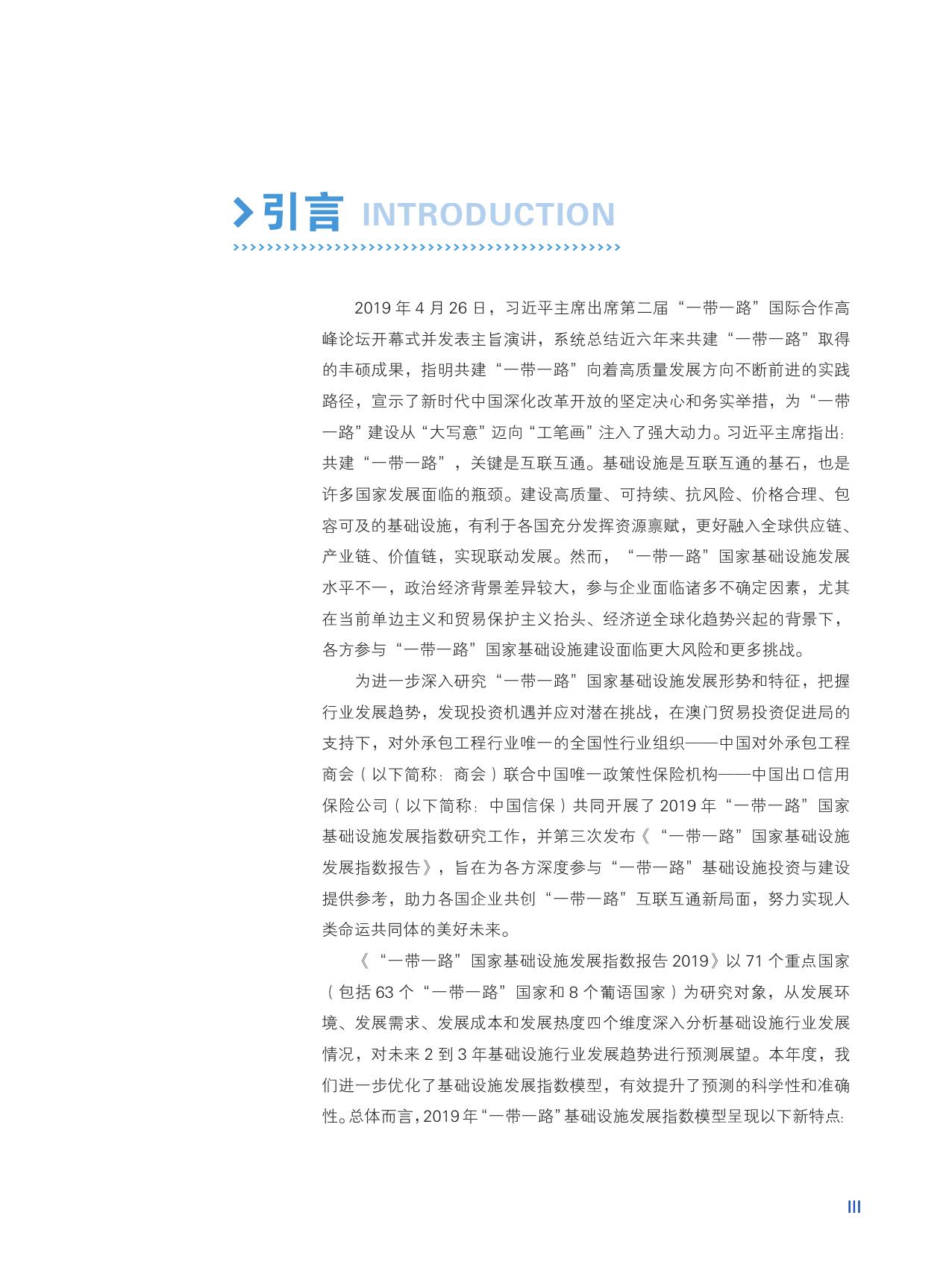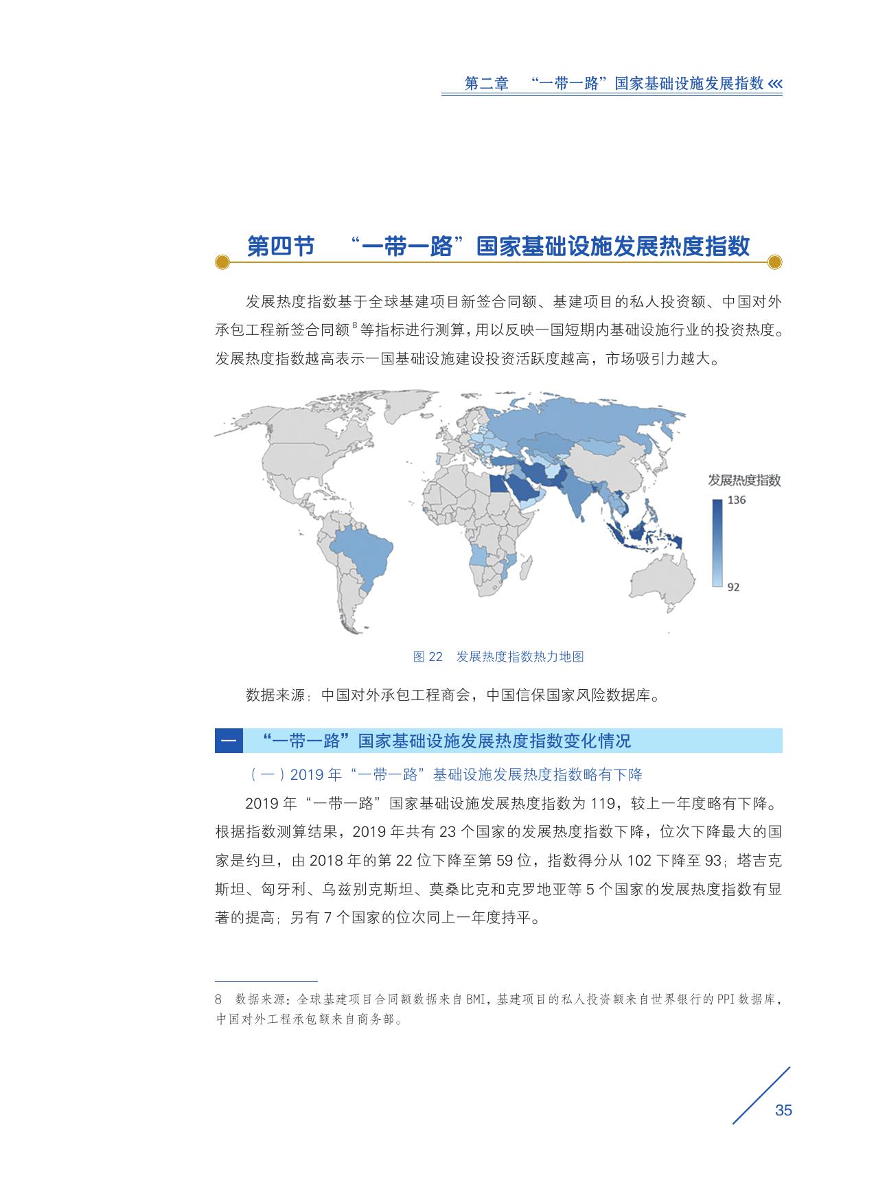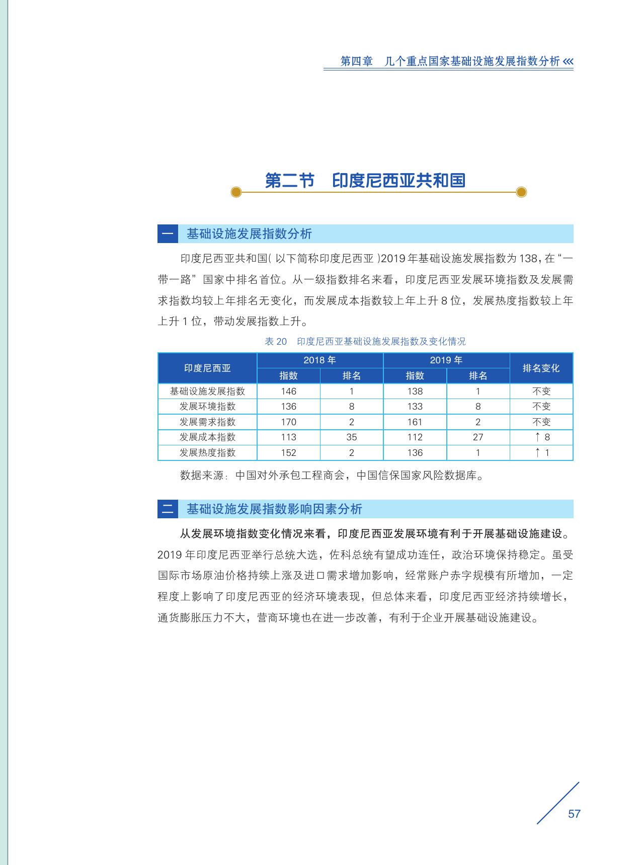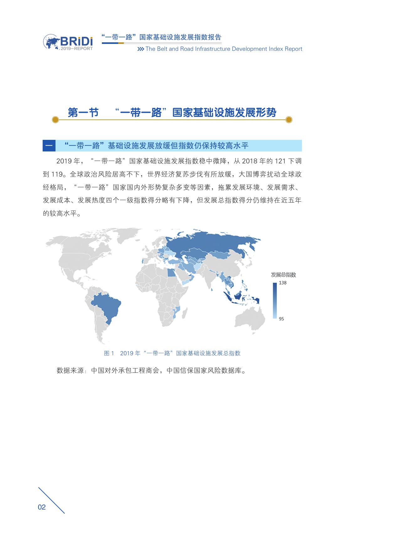 指数以 71 个重点国家 (63 个“一带一路”国家和 8 个葡语国家)为研究对象,从发展环境、发展需求、发展成本和发展热度四个维度深入分析基础设施行业发展情况,对未来2—3年基础设施行业的发展趋势进行了预测展望。