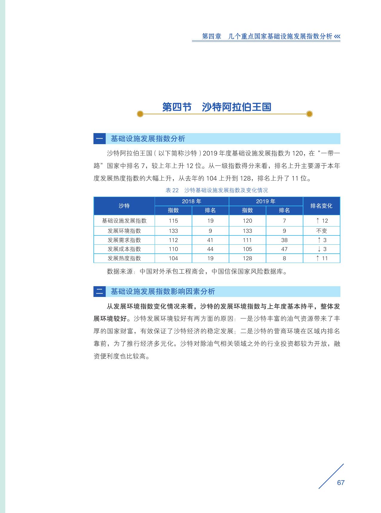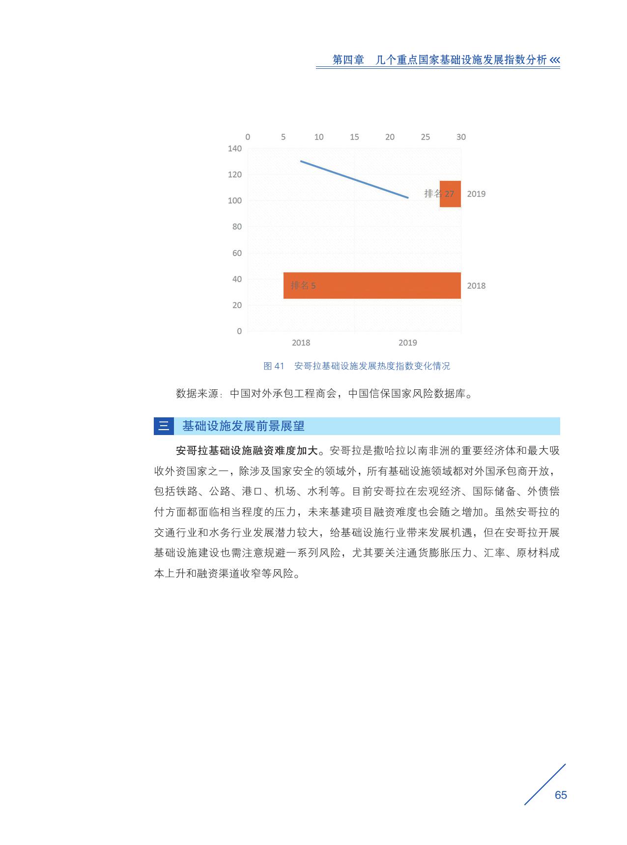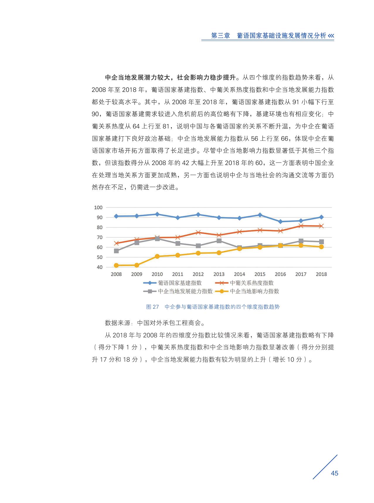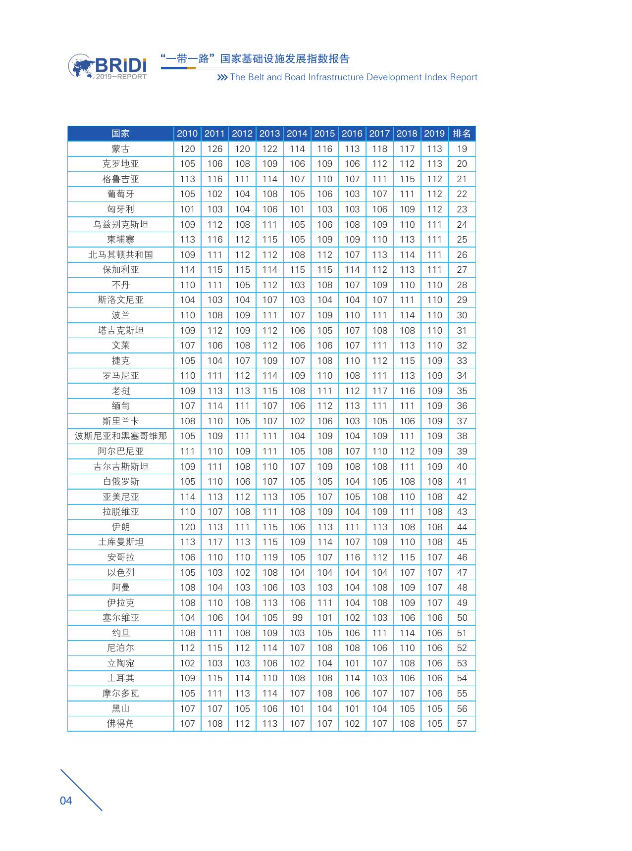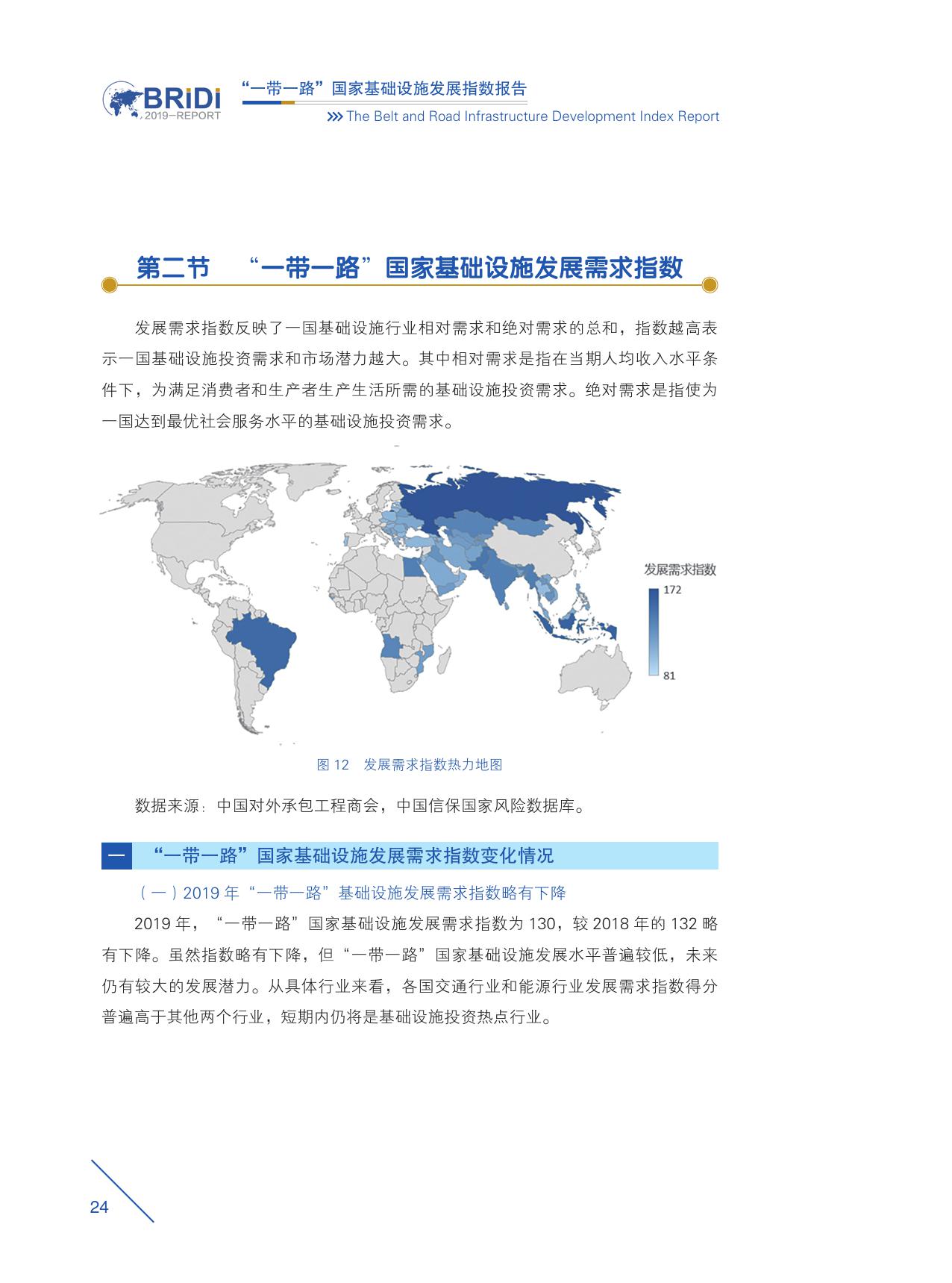 指数以 71 个重点国家 (63 个“一带一路”国家和 8 个葡语国家)为研究对象,从发展环境、发展需求、发展成本和发展热度四个维度深入分析基础设施行业发展情况,对未来2—3年基础设施行业的发展趋势进行了预测展望。