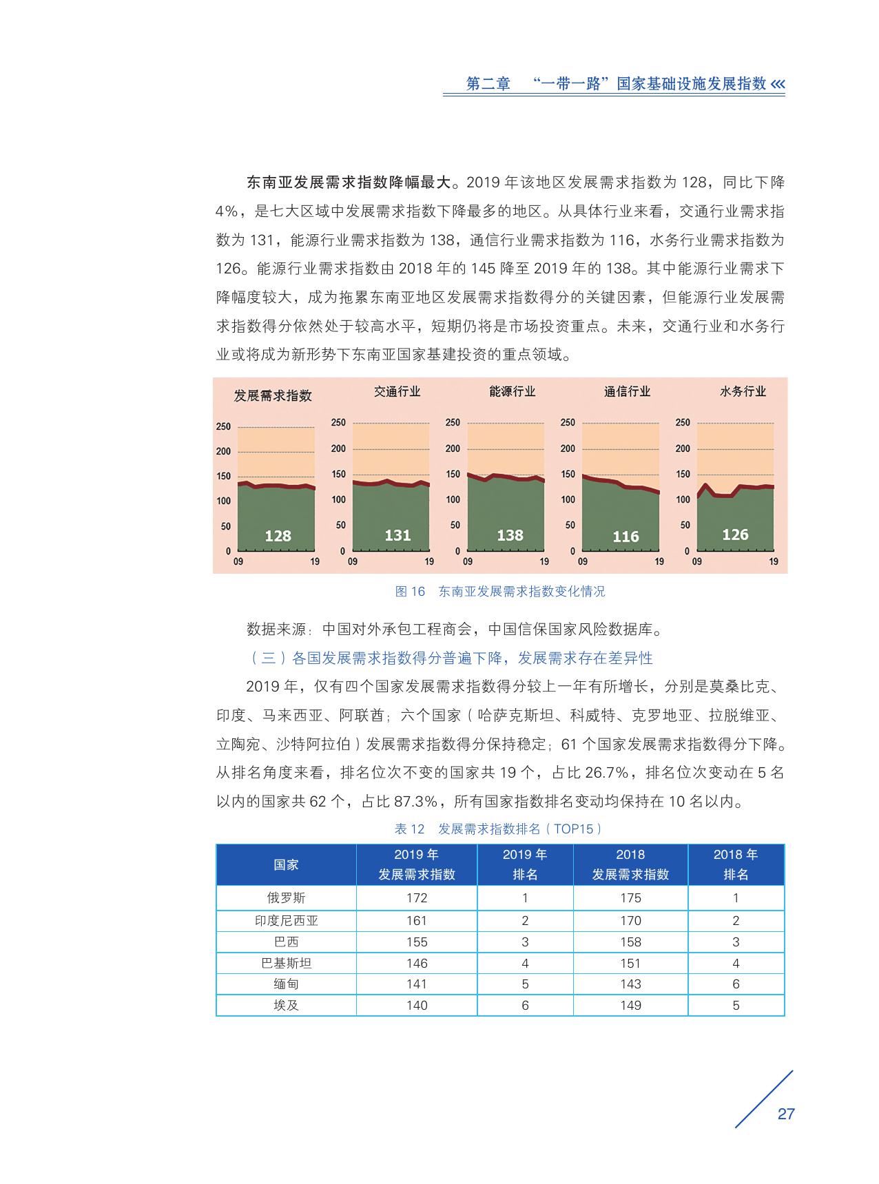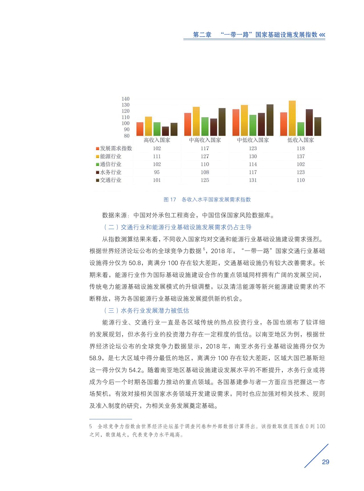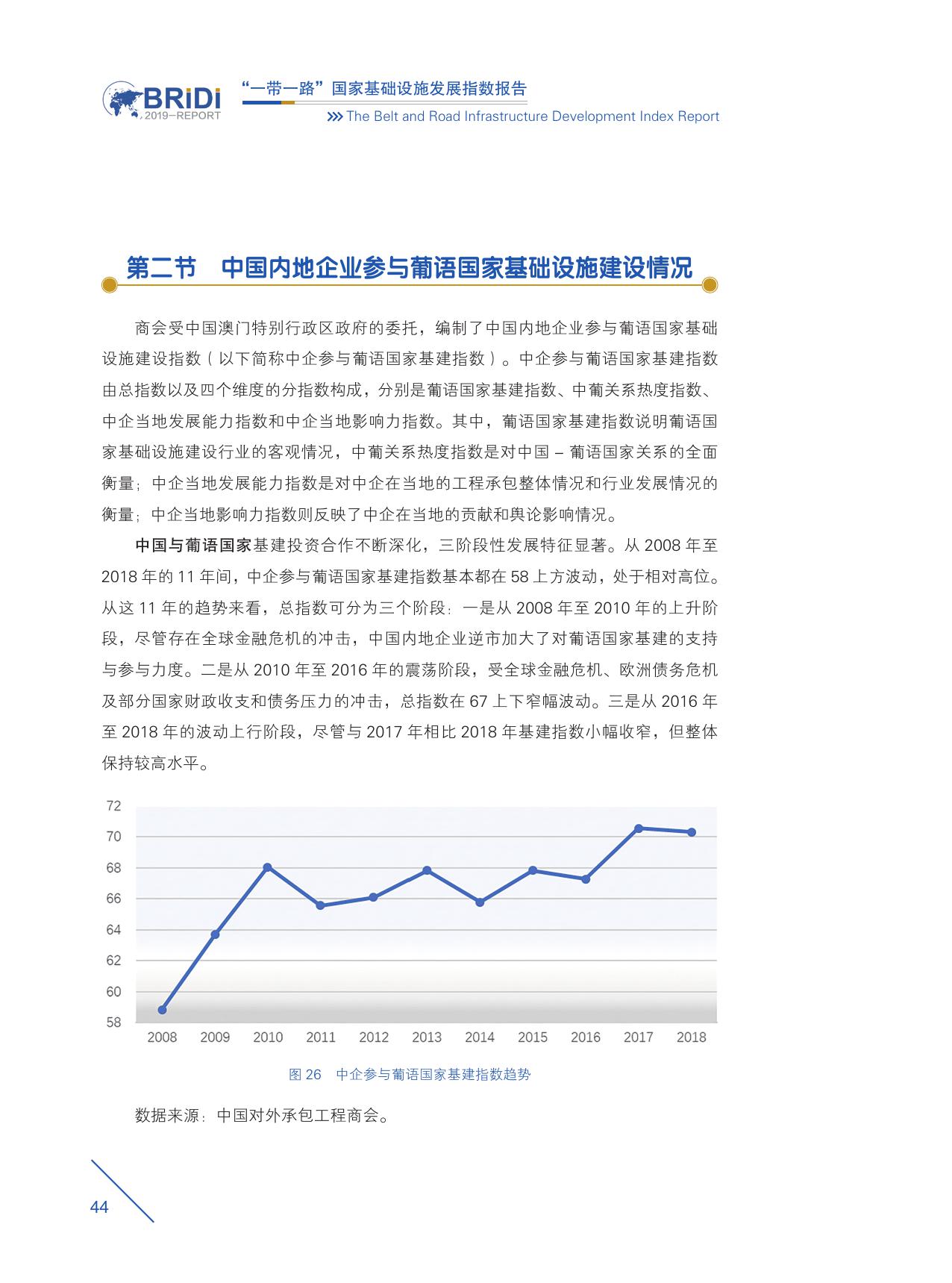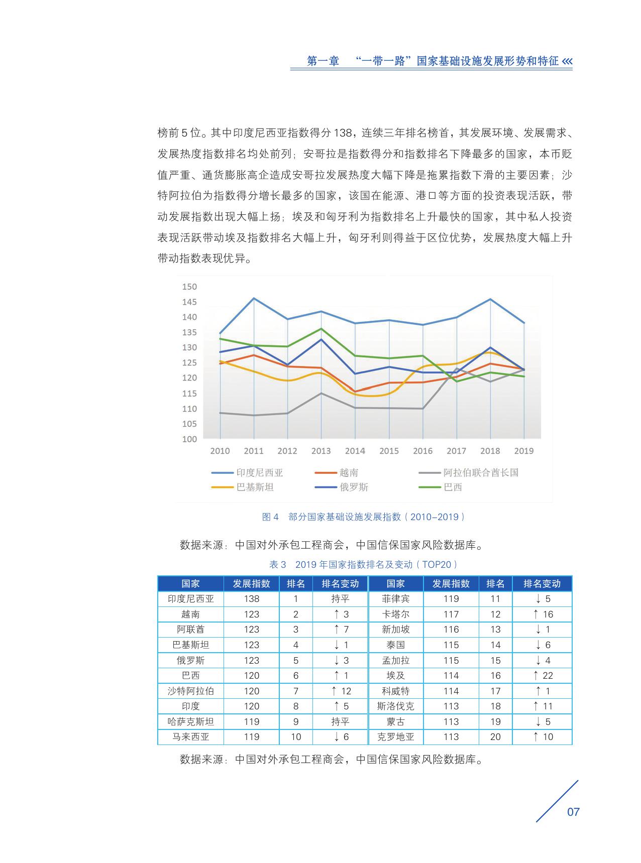 指数以 71 个重点国家 (63 个“一带一路”国家和 8 个葡语国家)为研究对象,从发展环境、发展需求、发展成本和发展热度四个维度深入分析基础设施行业发展情况,对未来2—3年基础设施行业的发展趋势进行了预测展望。
