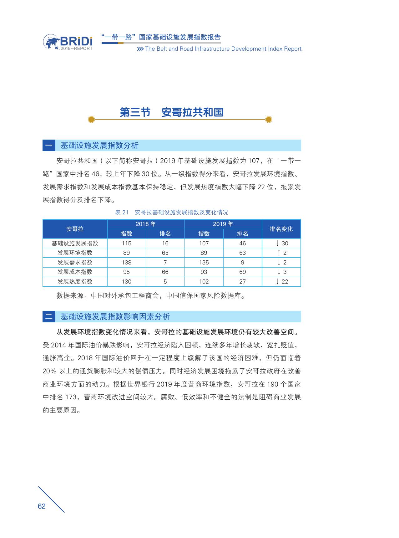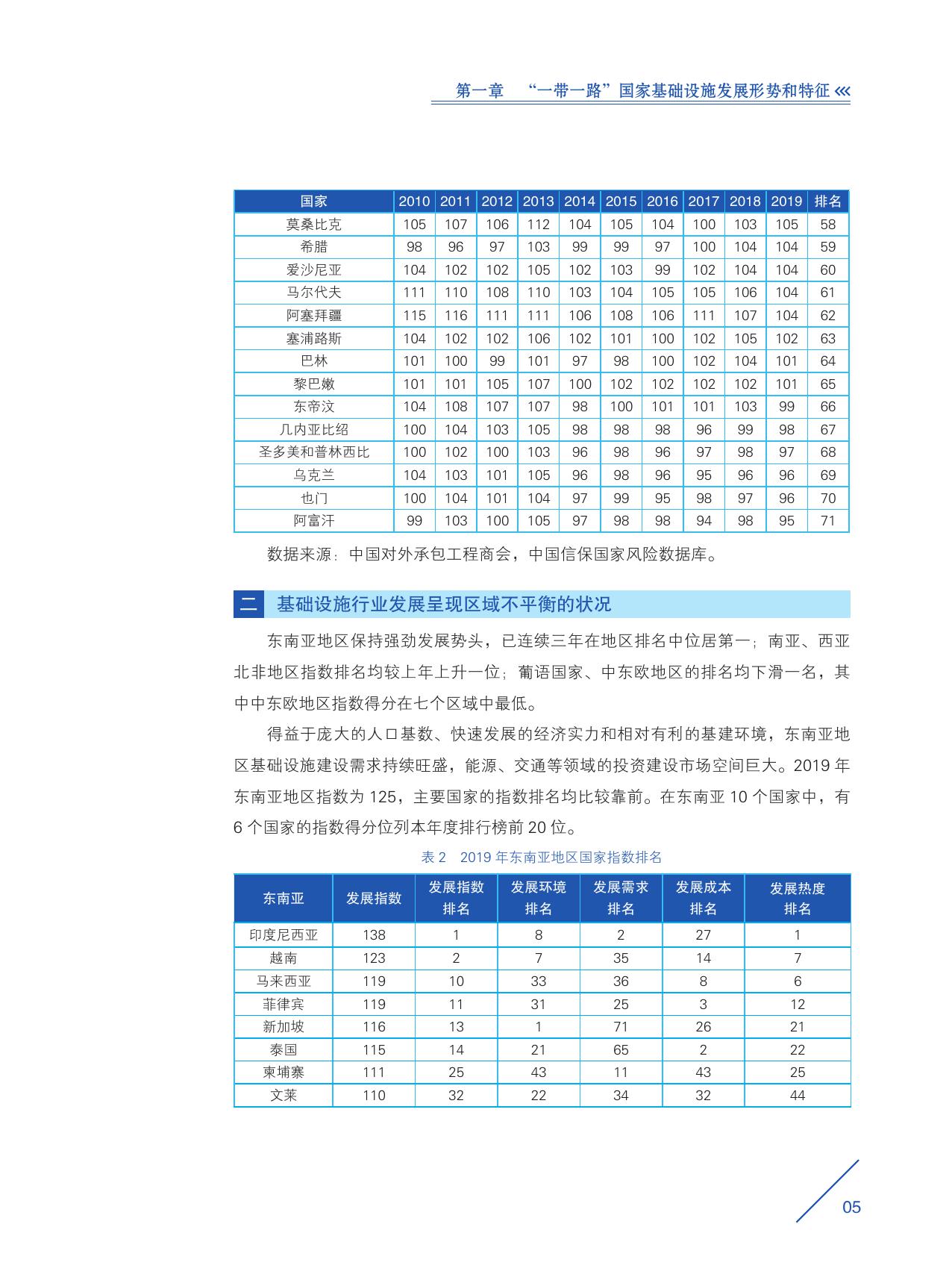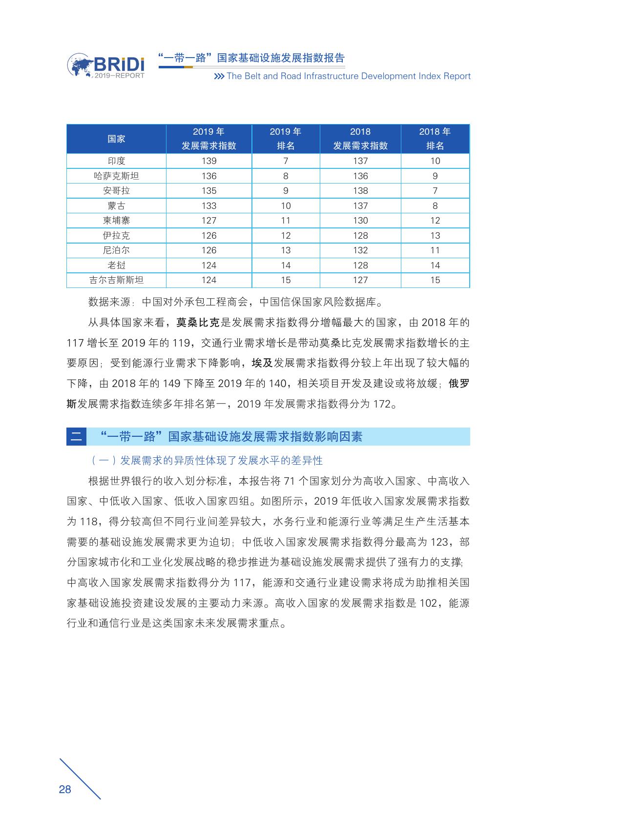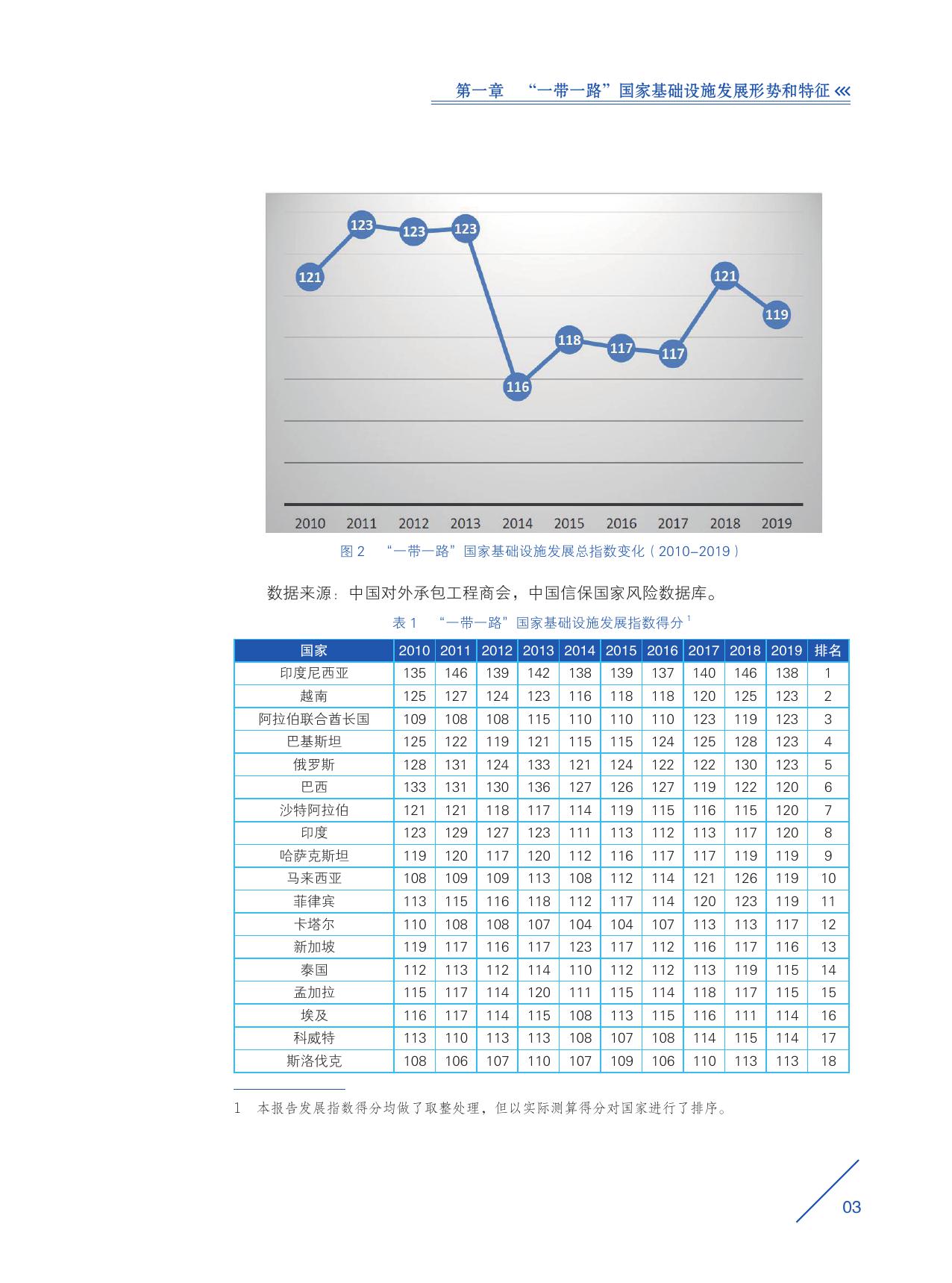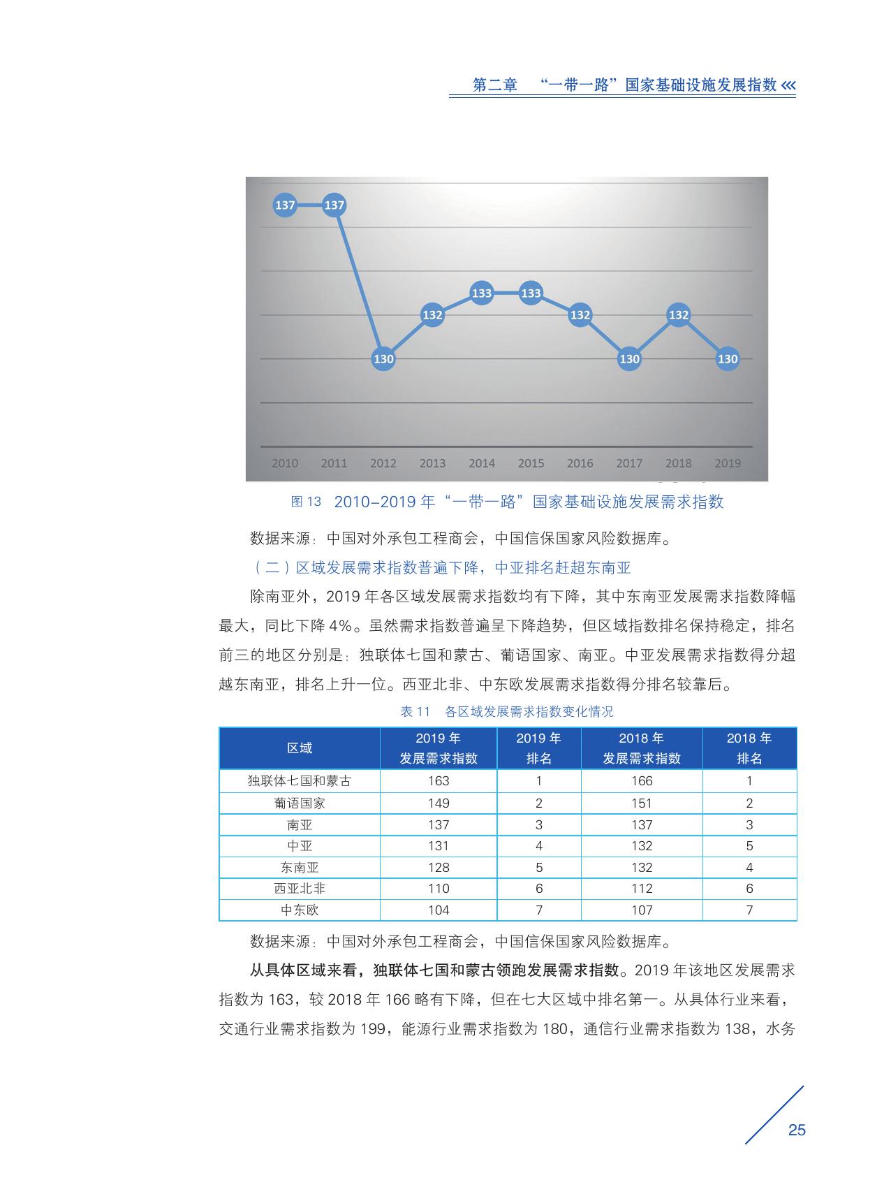 指数以 71 个重点国家 (63 个“一带一路”国家和 8 个葡语国家)为研究对象,从发展环境、发展需求、发展成本和发展热度四个维度深入分析基础设施行业发展情况,对未来2—3年基础设施行业的发展趋势进行了预测展望。