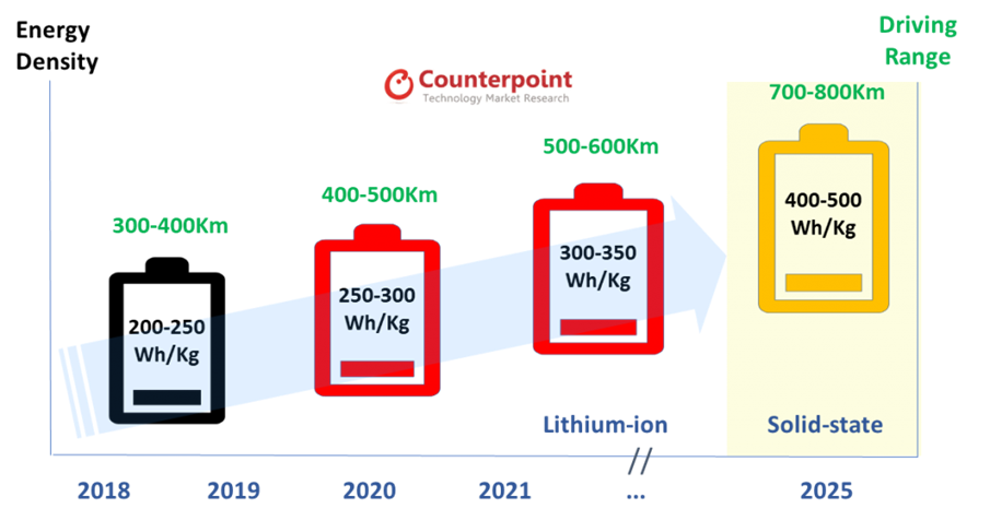 电池制造商一直将固态电池技术作为下一代技术,并展示了多个创新产品。从理论上讲,固态电池用聚合物或陶瓷材料制成的固体电解质替代了锂离子电池中的液体电解质,可降低物理撞击引起的电解质暴露或爆炸风险。固体电解质在高温和高容量下表现出色,可进一步提高能量密度。汽车制造商正在积极研发固态电池。到目前为止,丰田在固态电池专利申请数量方面排名第一。去年,大众汽车宣布将向固态电池制造商QuantumScape投资1亿美元,在2025年前大规模生产固态电池。