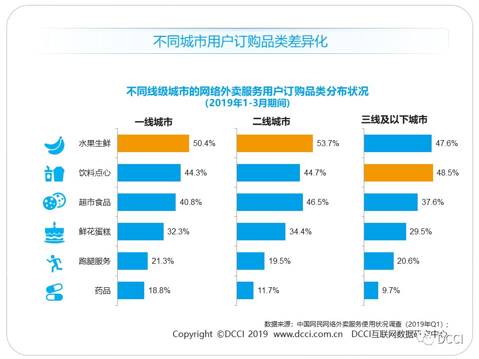 在非餐品类中,一线城市和二线城市的网络外卖用户中订购水果生鲜的占比最多,而在三线及以下城市中,订购饮料点心的网络外卖用户占比更多。同时,通过网络外卖平台订购药品的用户在一线城市中占比较多,可达18.8%。