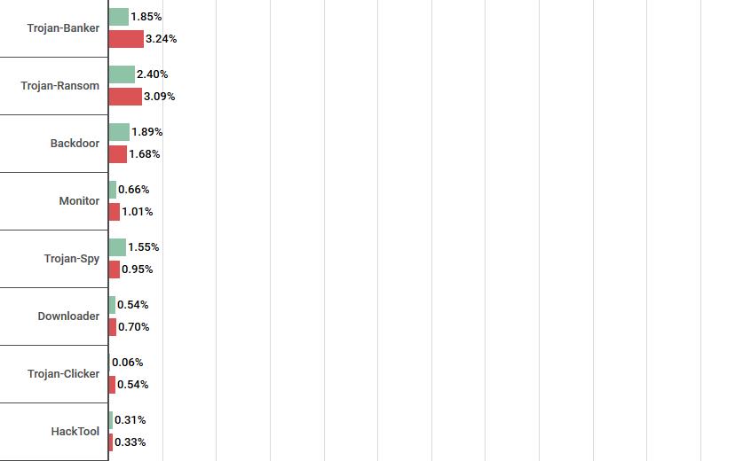 其中最大的份额是潜在的未经请求的RiskTool应用程序,占29.80%,下降了19%。排在第二位的是Trojan-Dropper(24.93%),其份额增长13%。
