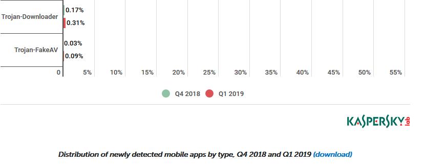 统计数据显示,2019年第一季度移动金融威胁的数量显著增加,手机银行特洛伊木马占所有检测到的威胁的3.24%,2018年第四季度的份额为1.85%。
