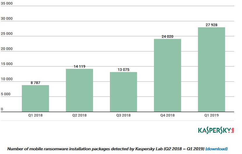 2019年第一季度,检测到27928个移动勒索软件安装包,比上一季度增加了3900个。