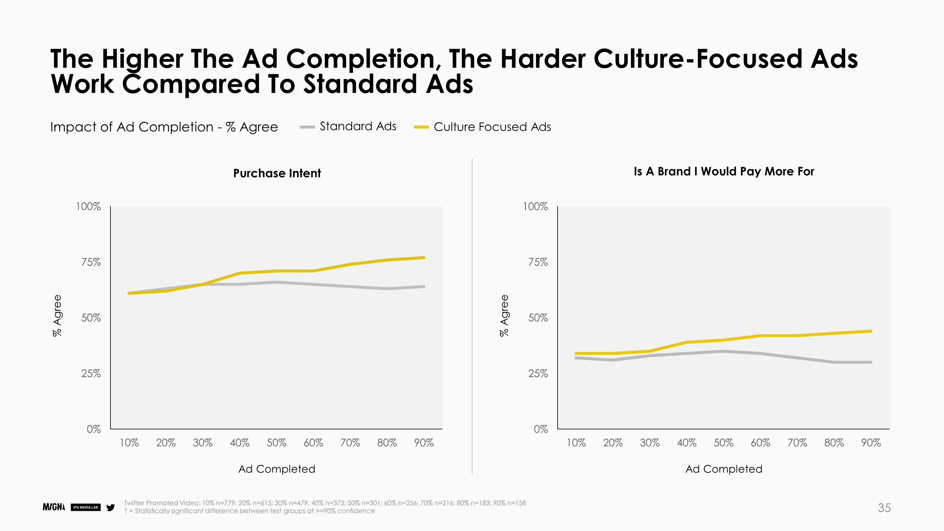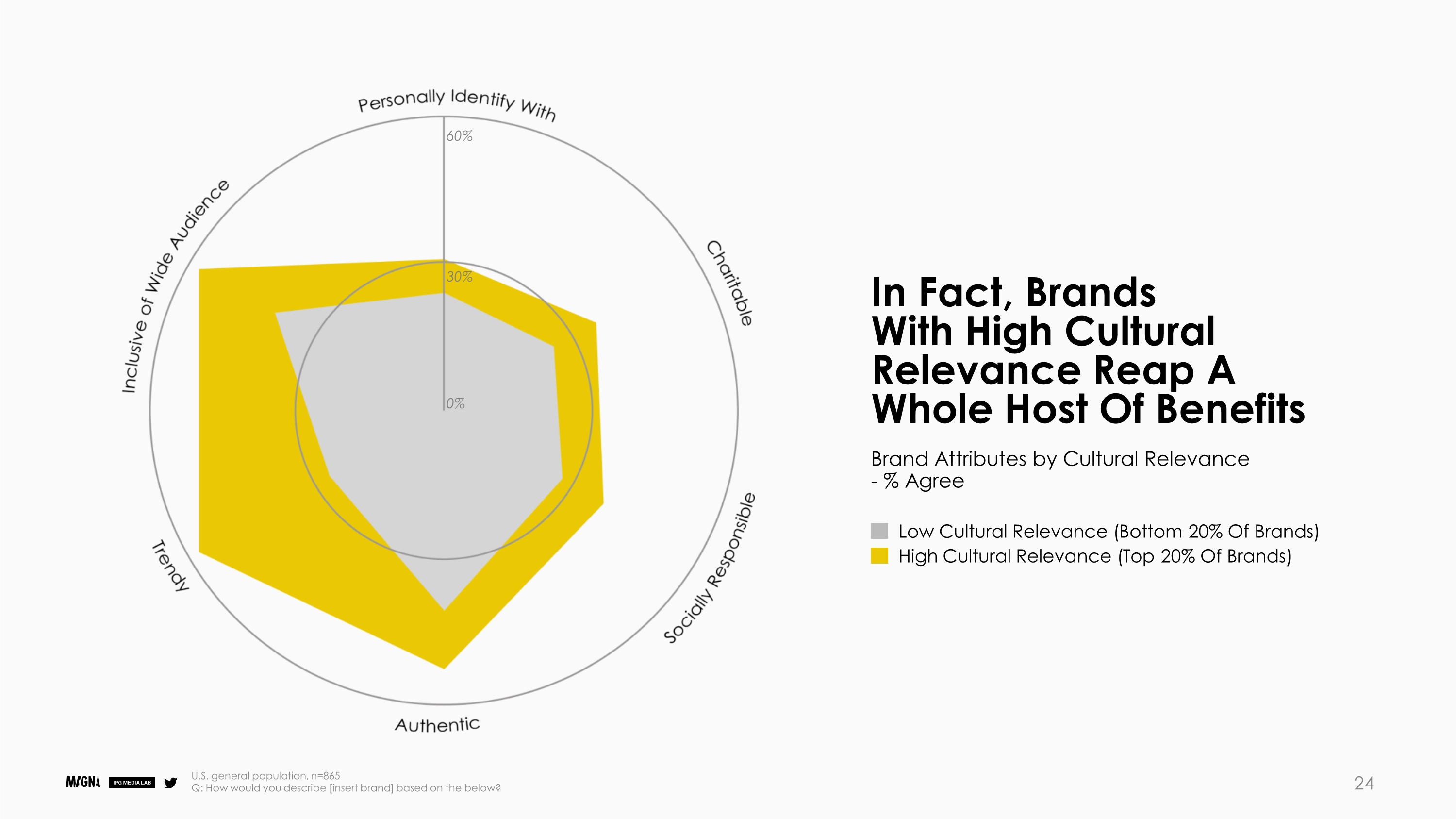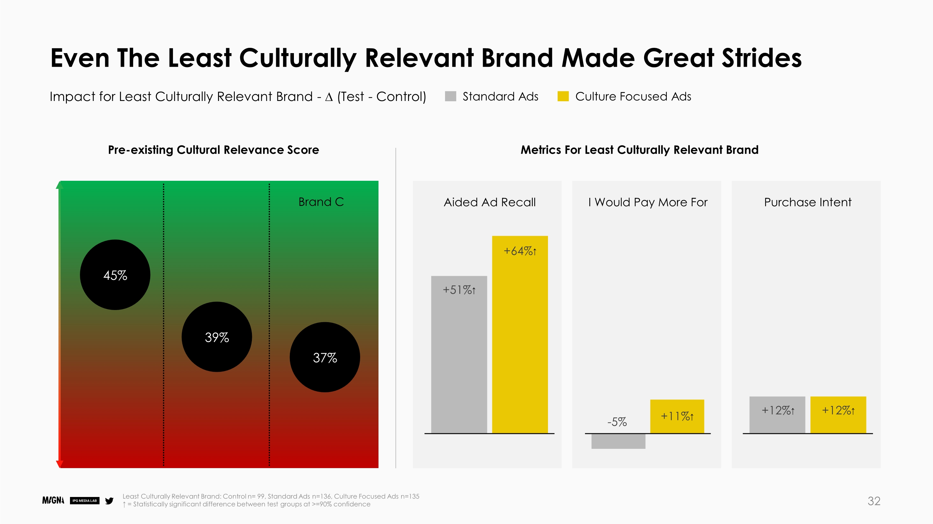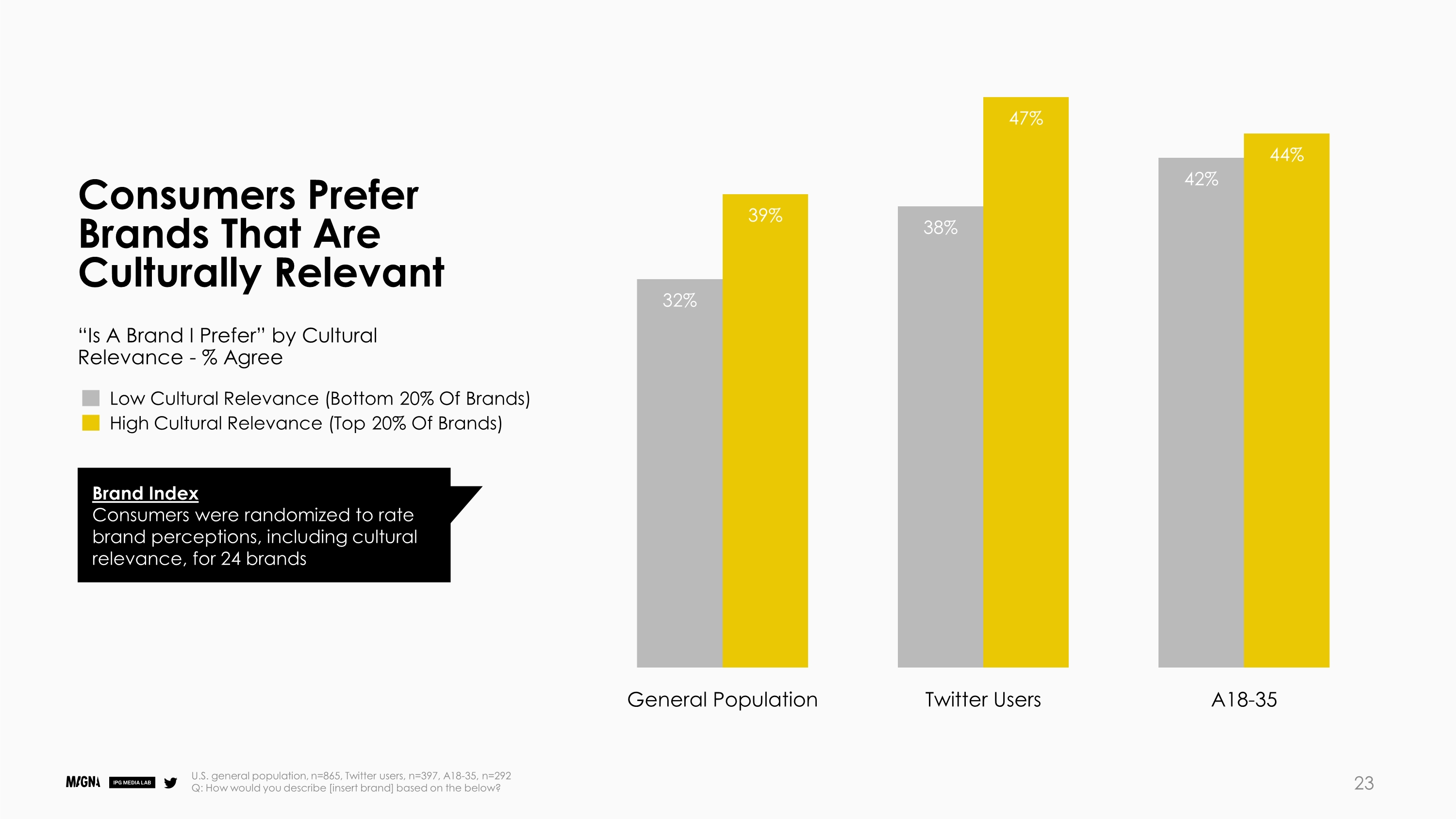 文化相关性很重要:虽然一般民众更喜欢文化相关性高的品牌,而不是文化相关性低的品牌(39% vs. 32%),但Twitter用户尤其如此。