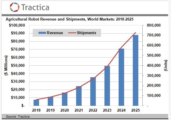 Tractica的报告“农业机器人”提供了2018-2025年农业机器人出货量和收入的8年期市场规模和预测,并按世界区域和应用类型进行了细分。它讨论了将影响农业机器人发展的全球市场趋势、驱动因素、挑战和技术问题。