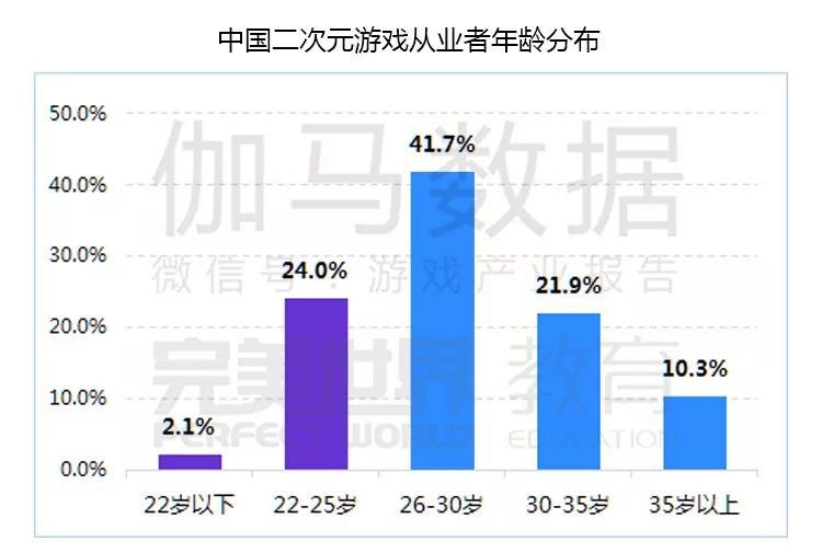 根据完美世界教育研究院&伽马数据发布的统计分析,现阶段中国二次元游戏从业者更多的集中在26岁以上,其占比超过70%。
