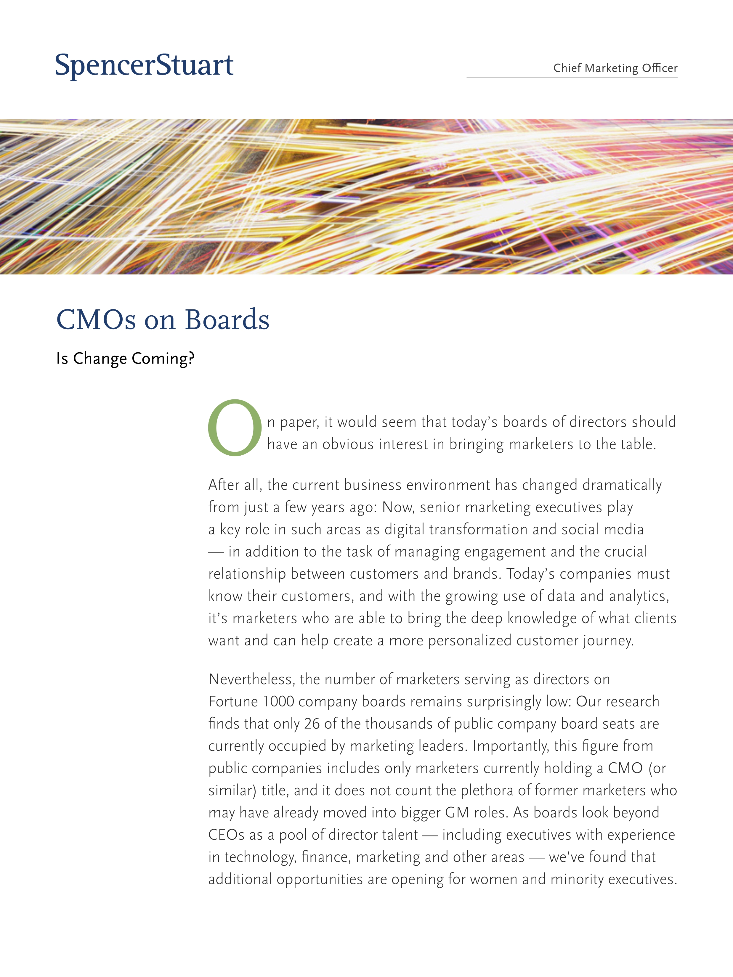 CMO(首席营销官)的角色变得越来越重要,但是,很少有CMO担任公司董事会的董事席位。Spencer Stuart的一项新研究报告发现,在美国财富1000强企业的数千个席位中,只有26个席位由CMO或类似职位的个人占据。