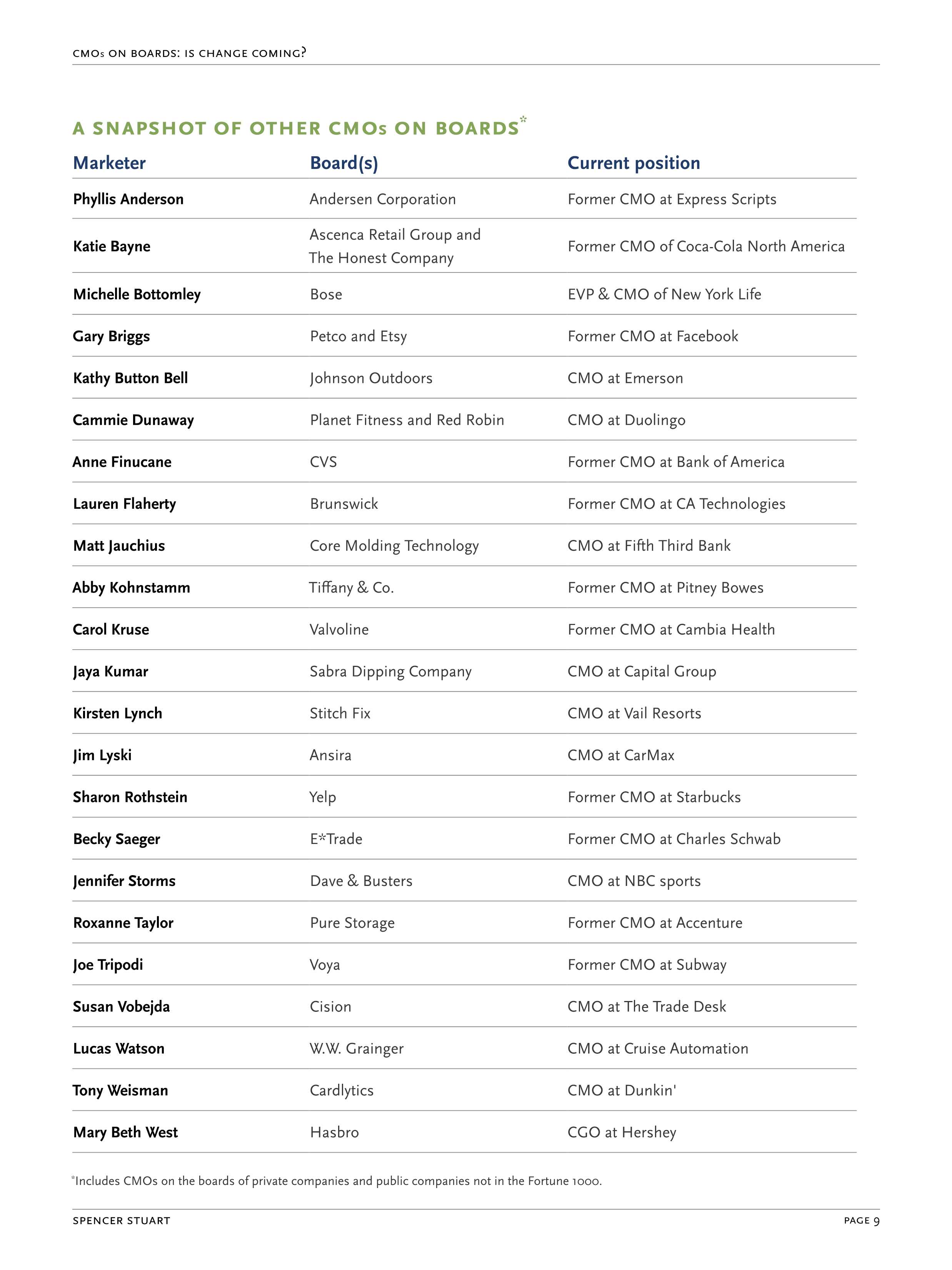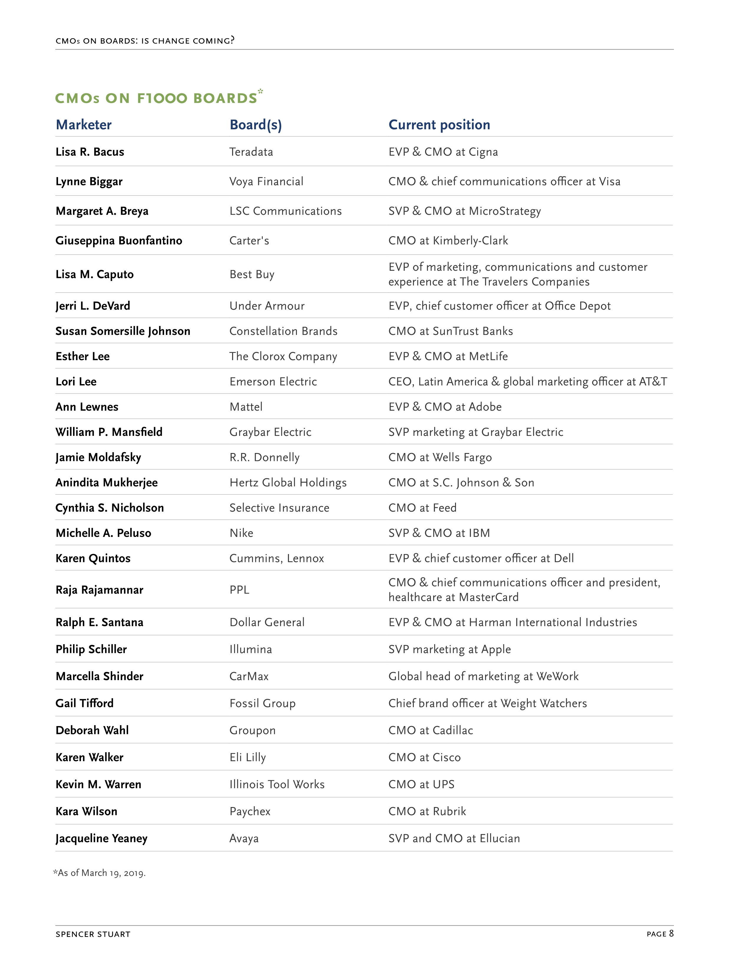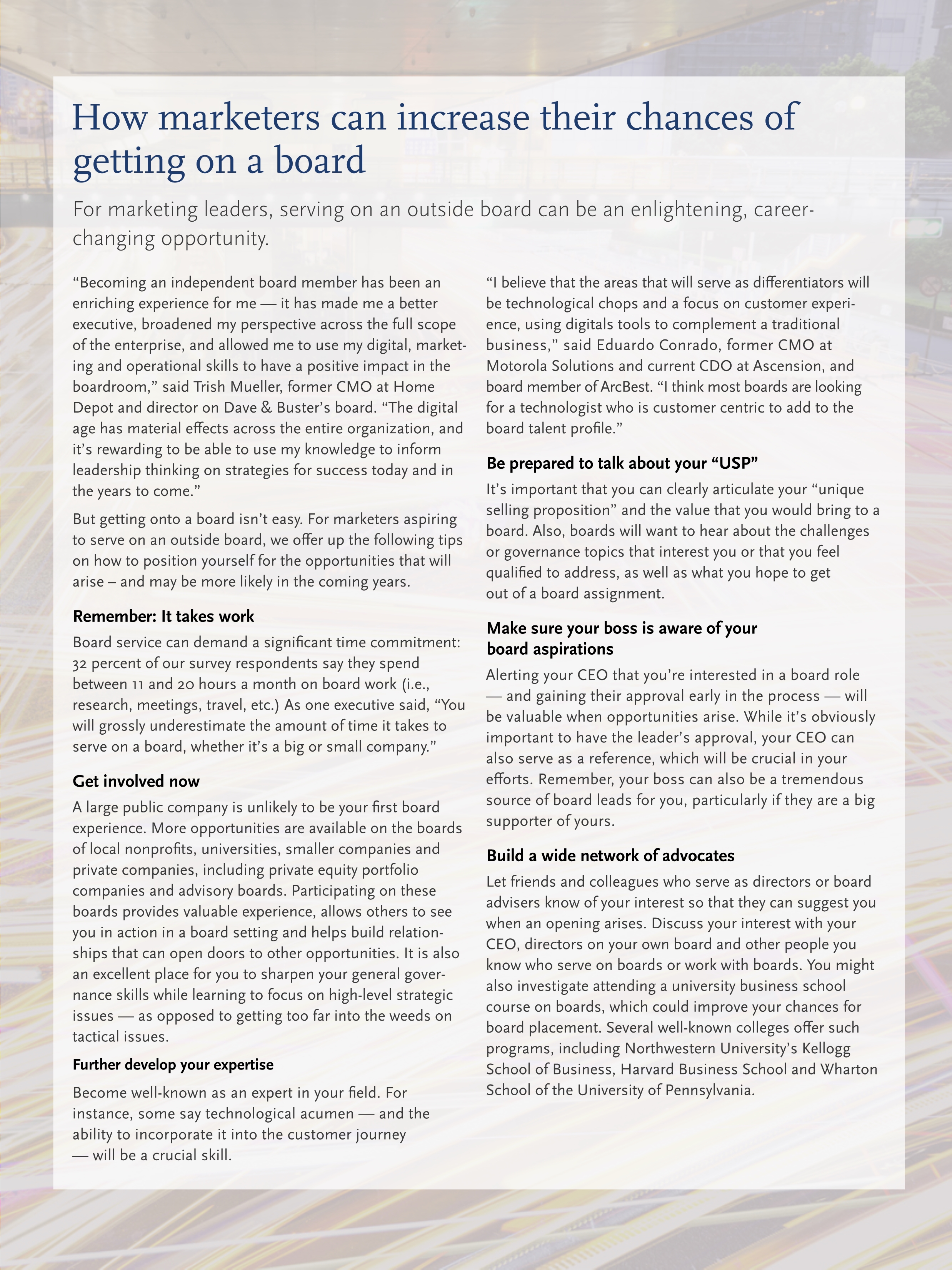 对于那些希望获得董事会席位的CMO, SpencerStuart建议开始在小公司董事会、当地非营利机构或学术机构寻求董事职位。