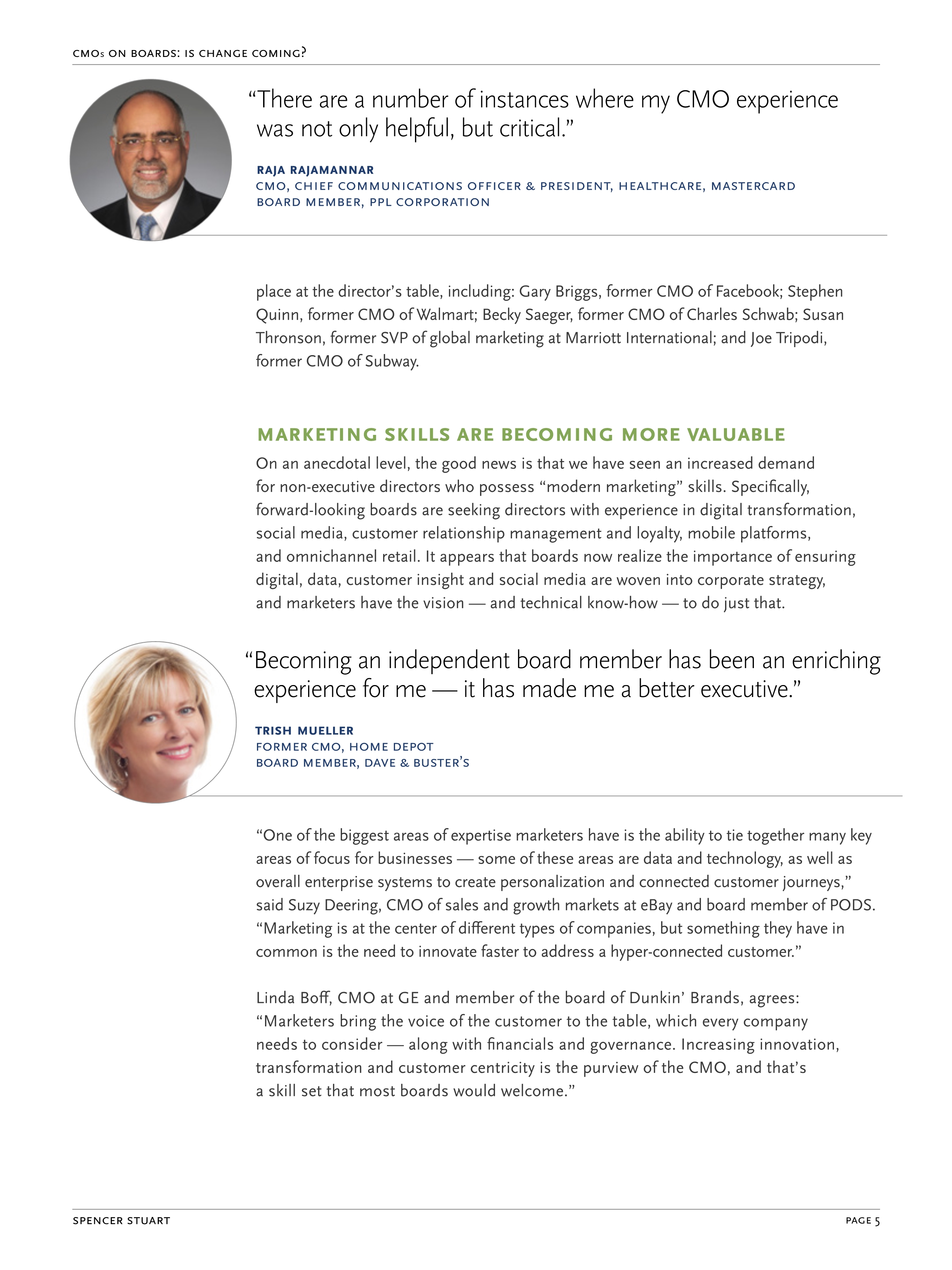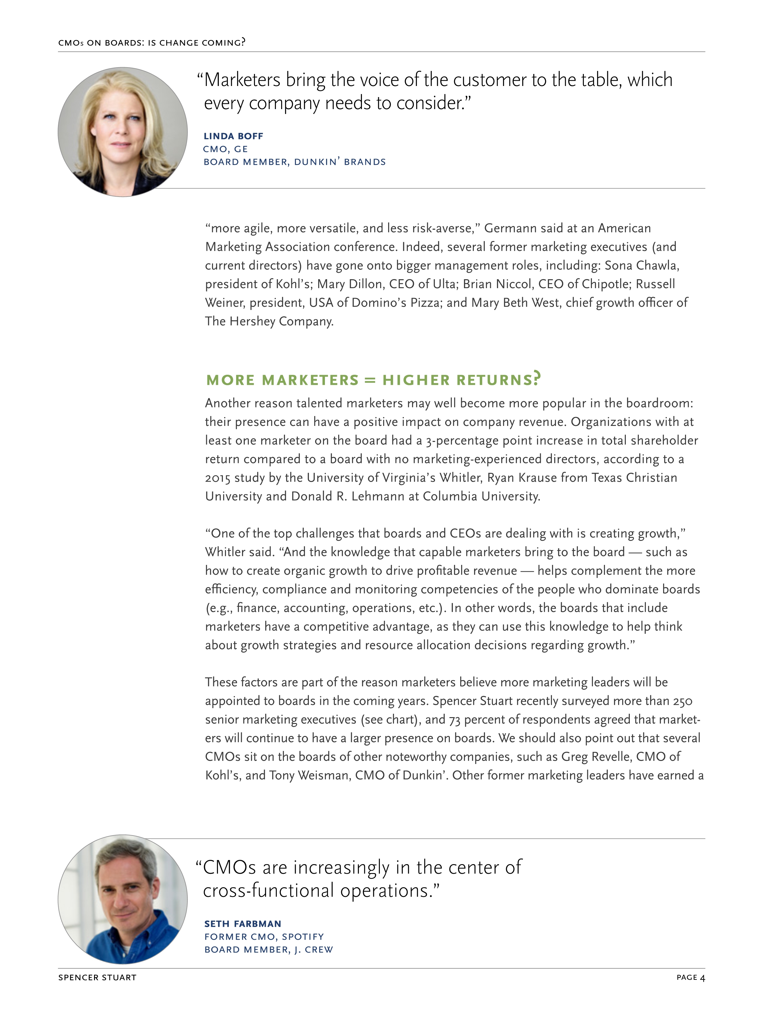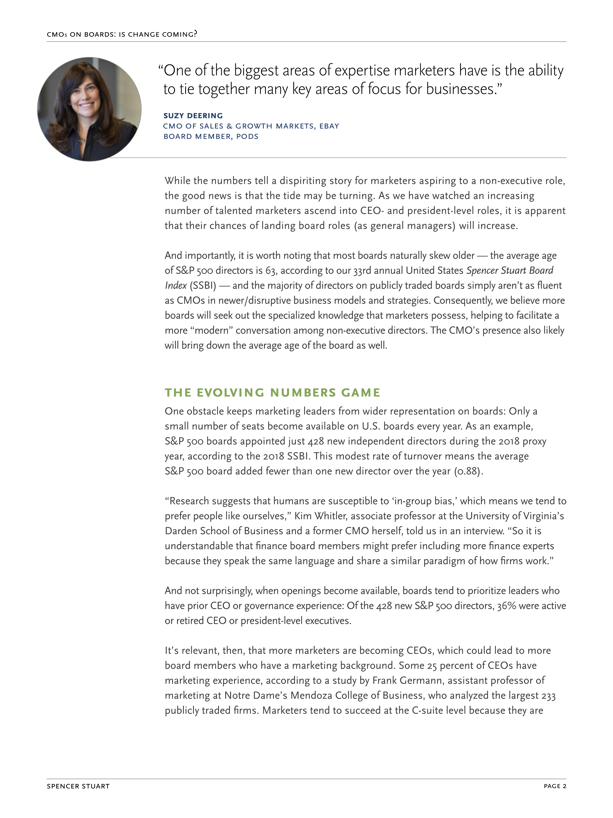 对于那些希望获得董事会席位的CMO, SpencerStuart建议开始在小公司董事会、当地非营利机构或学术机构寻求董事职位。