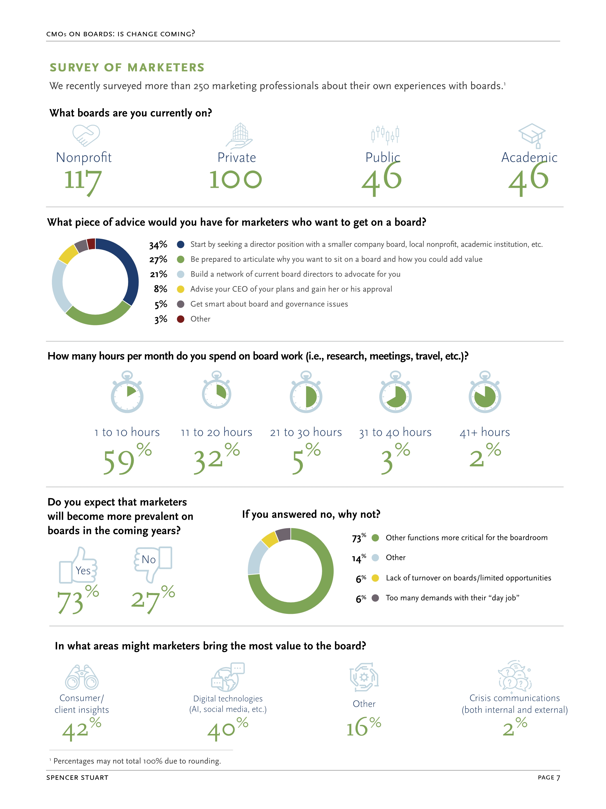 Spencer Stuart调查了250多名高级营销主管。这些营销专业人员目前在各种董事会中占有席位,包括非营利性(117个)、私营(100个)、公共(46个)和学术(46个)组织。