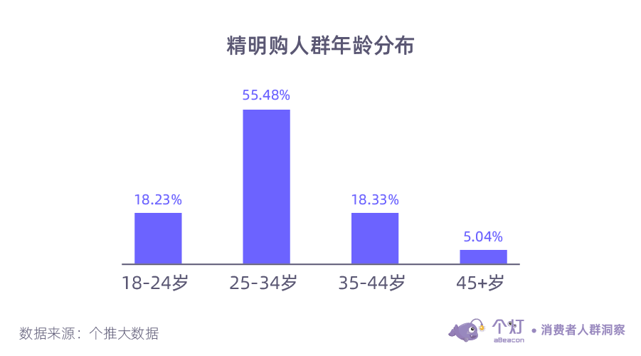 个推大数据显示,精明购人群大部分处于职场上升期,其中25-34岁占比达到55%。