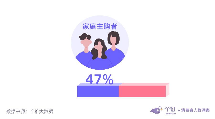 个推大数据显示,精明购人群中近47%为家庭主购者。相较于不常购物的购物外行,家庭主购者对各类商品了如指掌,不仅清楚知道哪些牌子的商品适合自己的家庭,而且能够迅速判定商品的真正价值,知道怎样在大减价时买到最合算的东西。