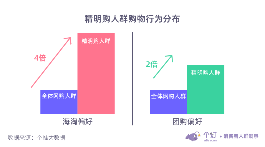 通过对精明购人群的兴趣偏好做深度挖掘,我们能看到他们的海淘偏好和团购偏好特别显著,分别为全体网购人群的4倍和2倍。通常情况下,高价格是高品质的一种保证,但不代表低价格就买不到高品质的商品。我们基于数据分析判断,精明购人群更偏爱在替代品中挑选品质接近而价格大幅降低的相似商品。