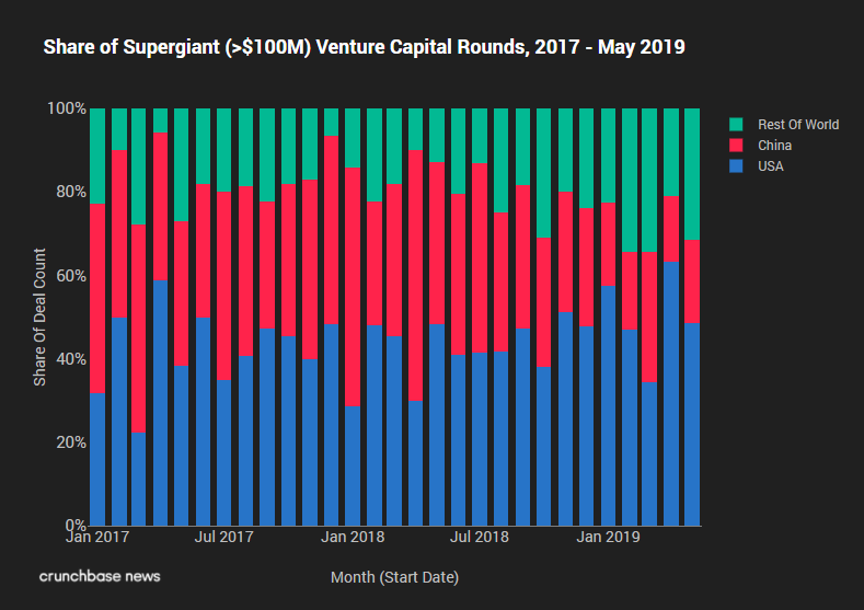 下图显示了美国、中国和世界其他地区的初创公司每月的大额交易量所占的百分比。
