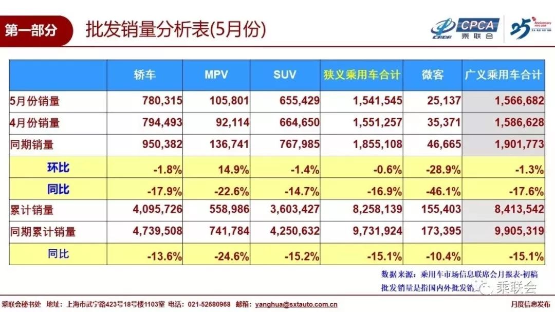 5月狭义乘用车零售158.2万台,同比下降12.5%,相对于今年1-4月累计同比-11.9%降幅基本持平,同比降幅较上月收窄。
