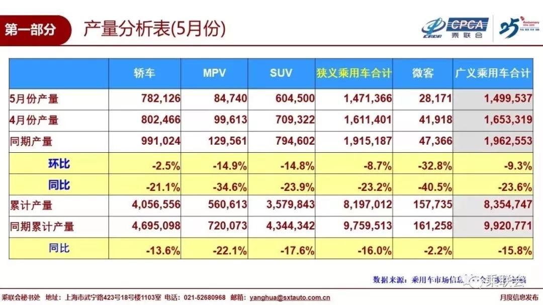 5月狭义乘用车生产147.1万台,环比4月下降8.7%,同比去年5月下降23.2%。由于国六实施的零部件企业供给侧瓶颈严重,国五车型减产但国六供给不足导致狭义乘用车总体产量下降较大。