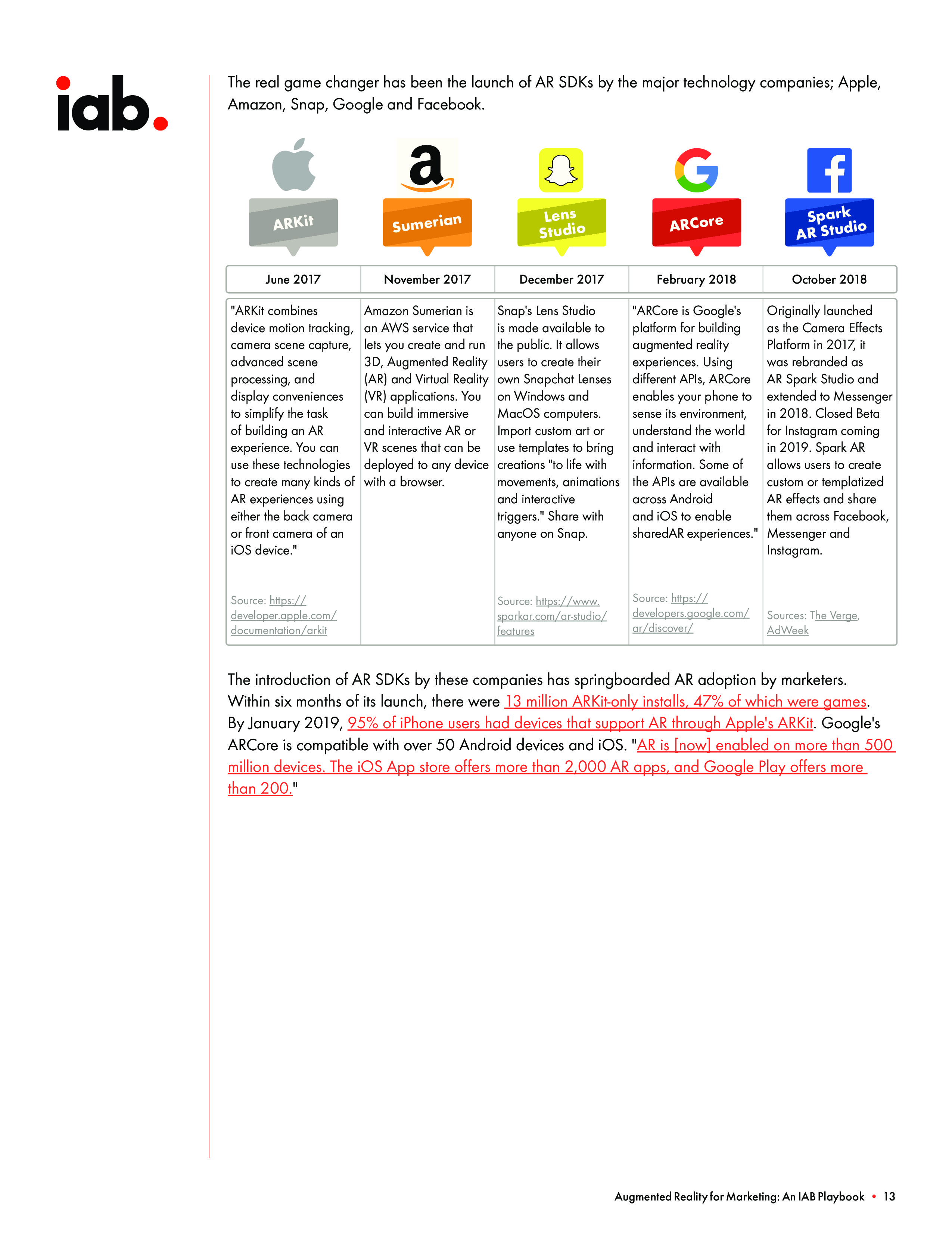 营销技术企业越来越关注AR平台开发以及创建易于使用的新界面,这样营销人员就可以轻松使用这项新技术。包括苹果、亚马逊、Snap、谷歌和Facebook在内的科技巨头都在过去18个月内推出了AR软件开发工具包(SDK)。增加投资与消费者使用量的提升密切相关。据调查,95%的iPhone用户在今年年初使用过支持苹果ARKit的AR设备。