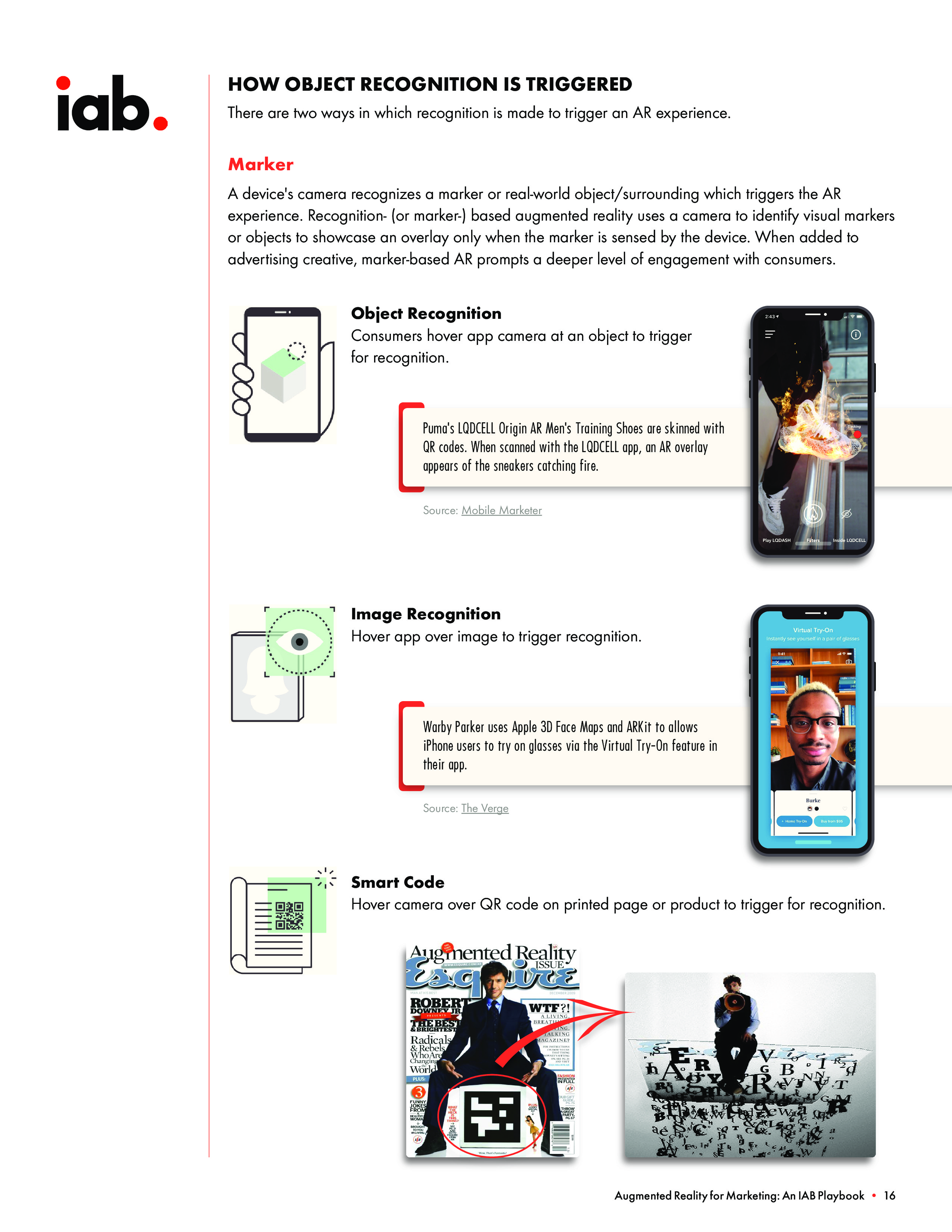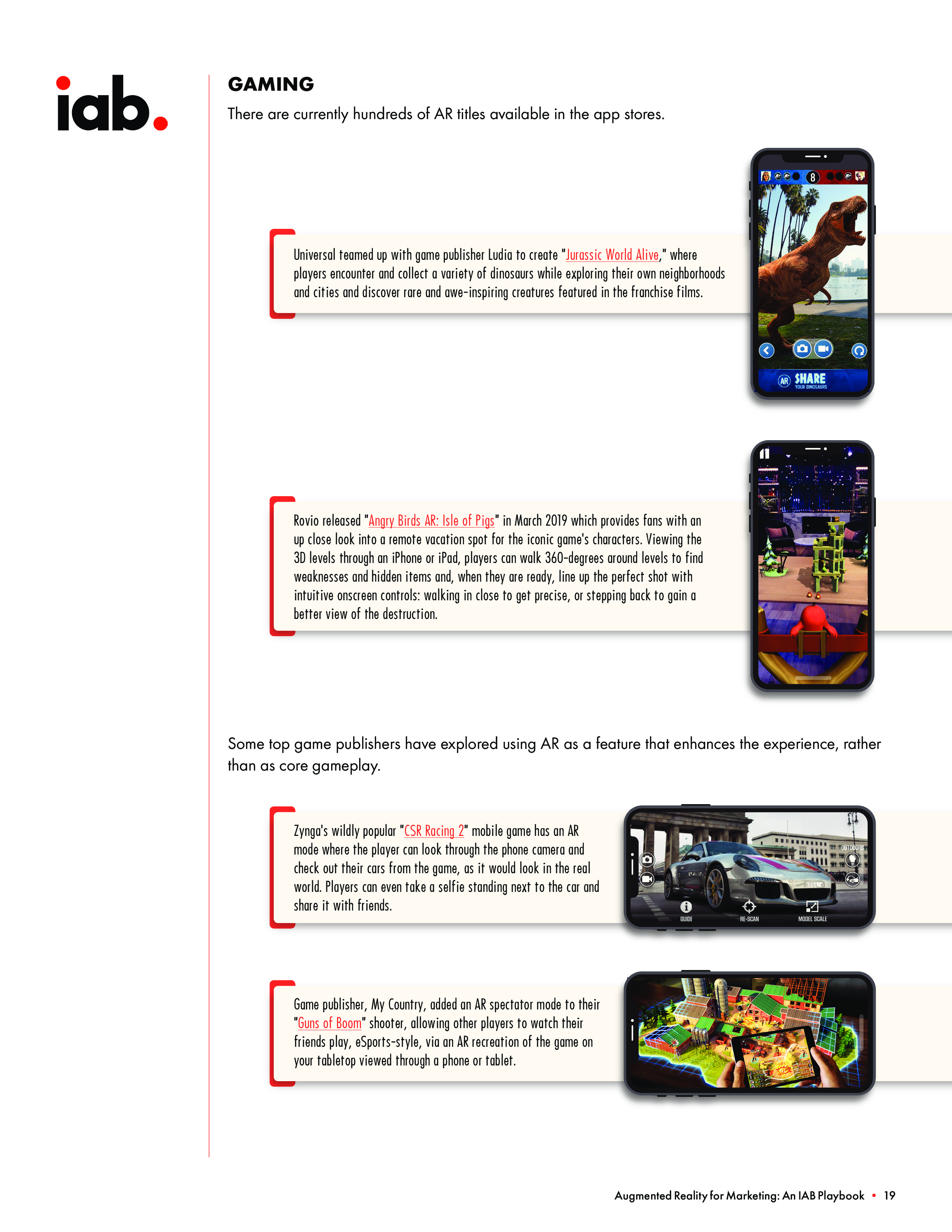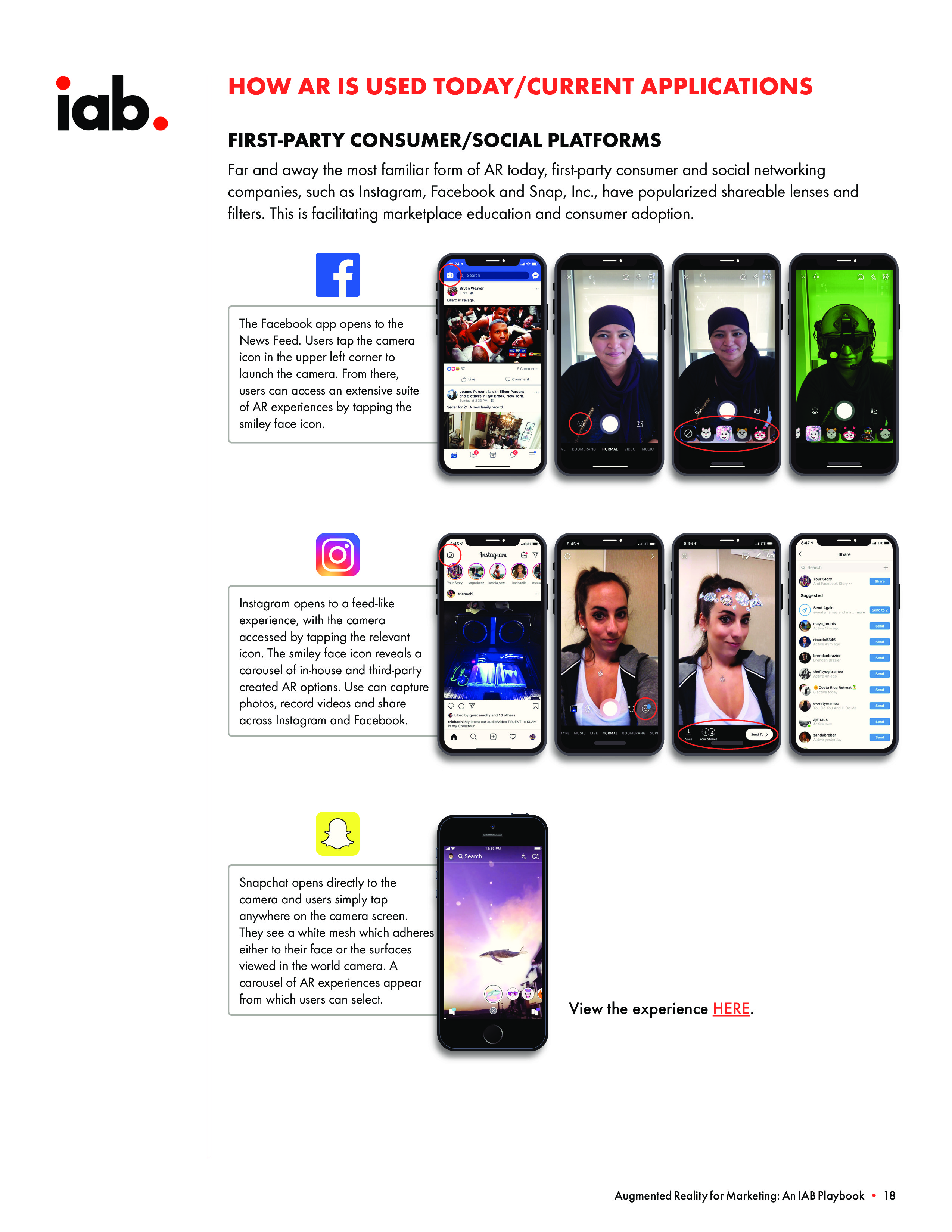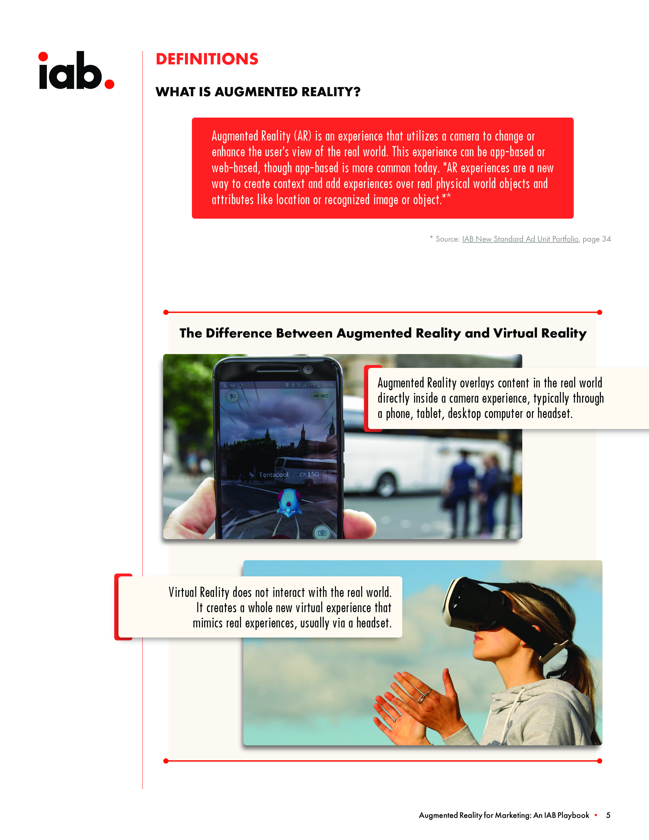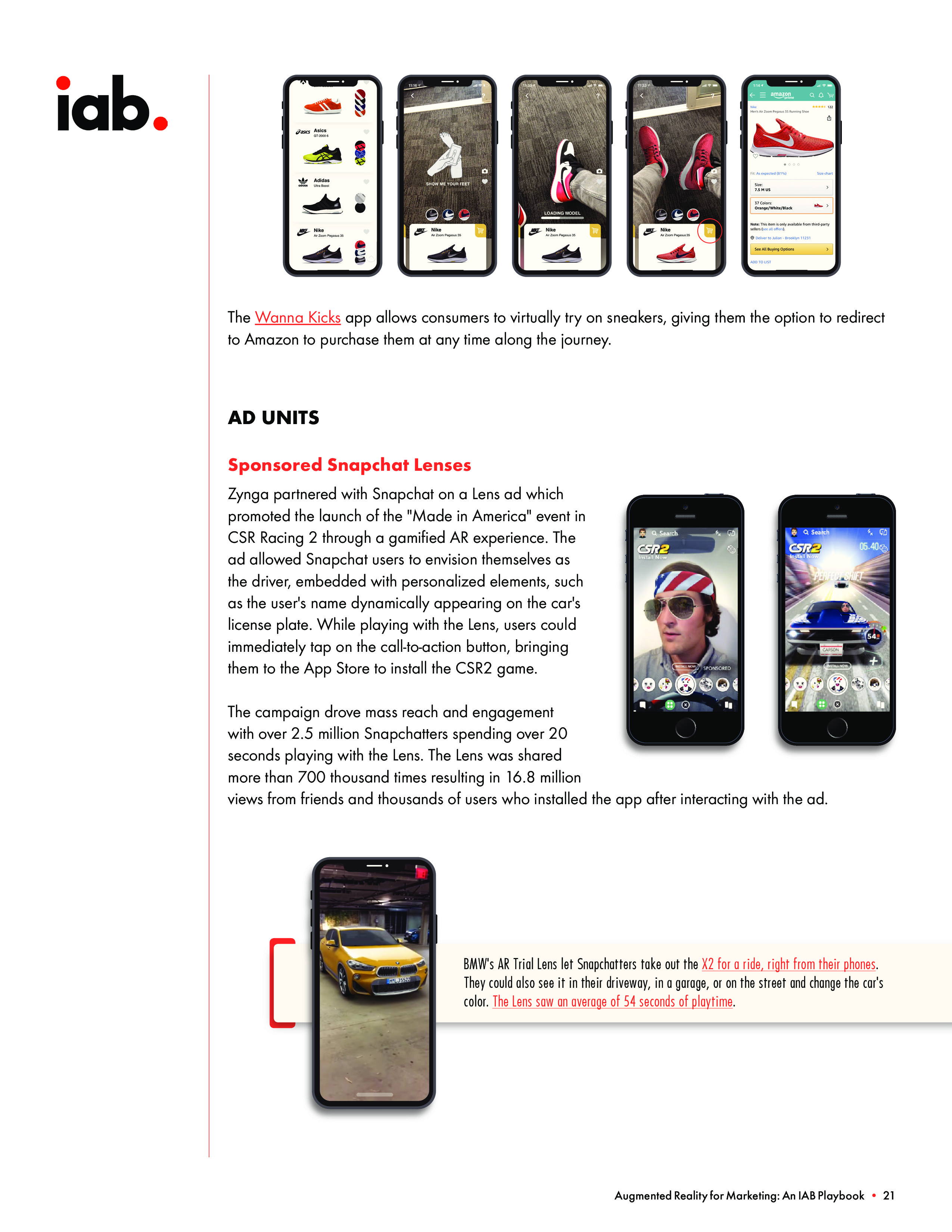 IAB发布了新报告“增强现实在营销中的应用”。增强现实(AR)在消费者中越来越受欢迎,营销人员可以将其作为展现创意的渠道。该技术在各种营销渠道中得到广泛应用,人们只需要带摄像头和应用程序的移动设备就可以体验。